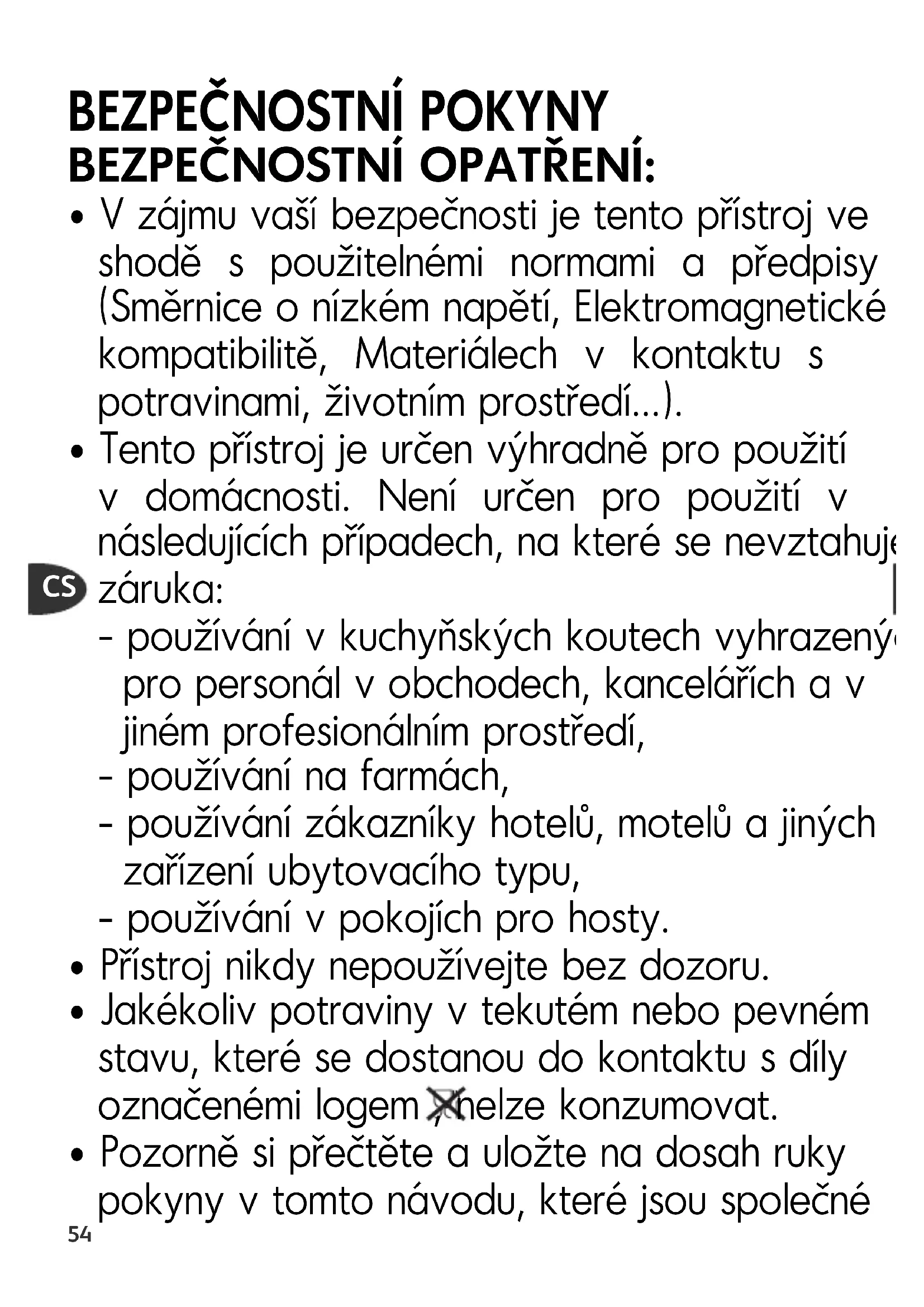 - V zájmu vaší bezpečnosti je tento přístroj ve shodě s použitelnémi normami a předpisy (Směrnice o nízkém napětí, Elektromagnetické kompatibilitě, Materiálech v kontaktu s potravinami, životním prostředí...).