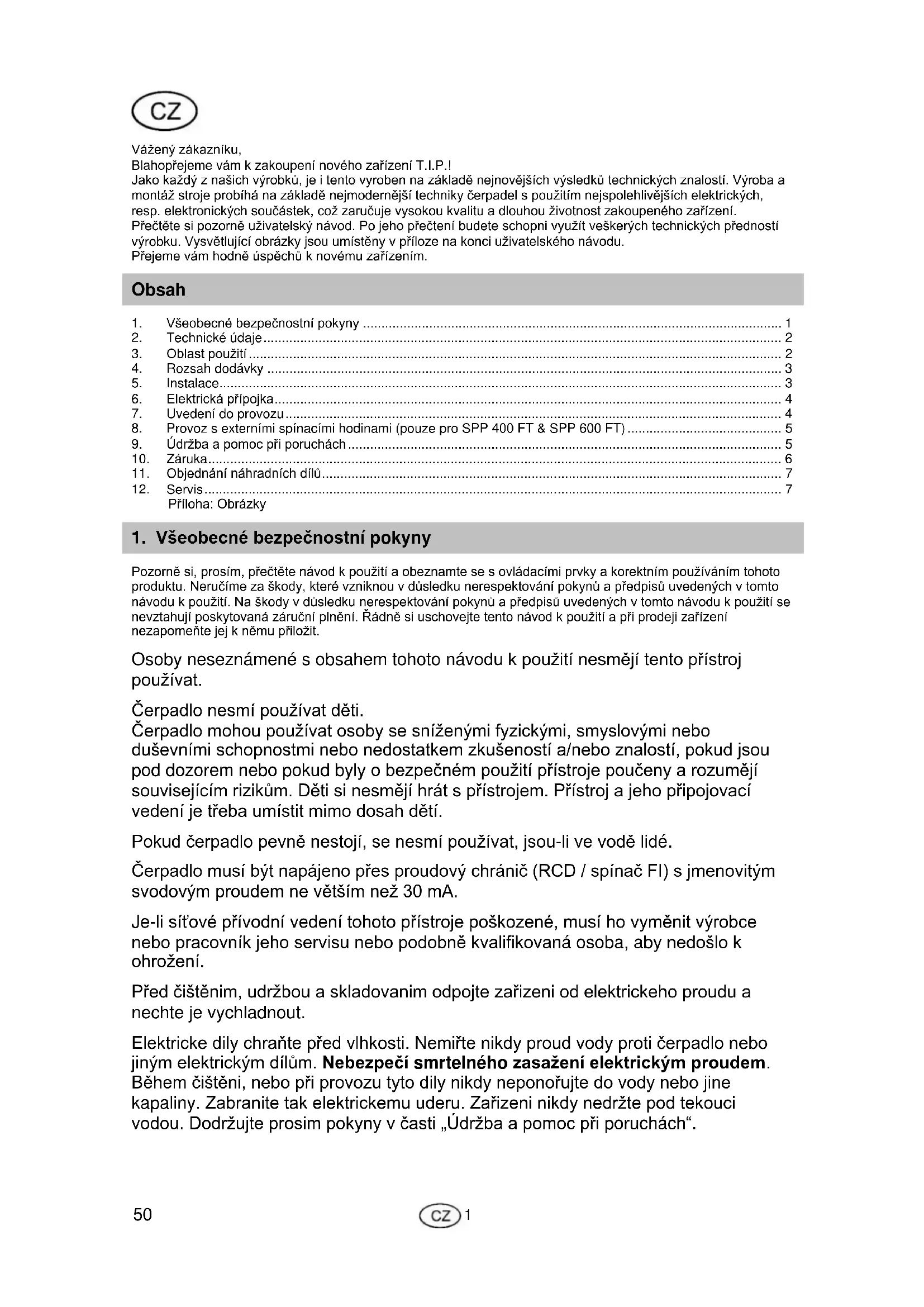 - Vážený zákazníku, Blahopřejeme vám k zakoupení nového zařízení T.I.P.! Jako každý z našich výrobků, je i tento vyroben na základě nejnovějších výsledků technických znalostí. Výroba a montáž stroje probíhá na základě nejmodernější techniky čerpadel s použitím nejspolehlivějších elektrických, resp. elektronických součástek, což zaručuje vysokou kvalitu a dlouhou životnost zakoupeného zařízení. Přečtěte si pozorně uživatelský návod. Po jeho přečtení budete schopni využít veškerých technických předností výrobku. Vysvětlující obrázky jsou umístěny v příloze na konci uživatelského návodu. Přejeme vám hodně úspěchů k novému zařízením. Obsah 1. Všeobecné bezpečnostní pokyny p. 1