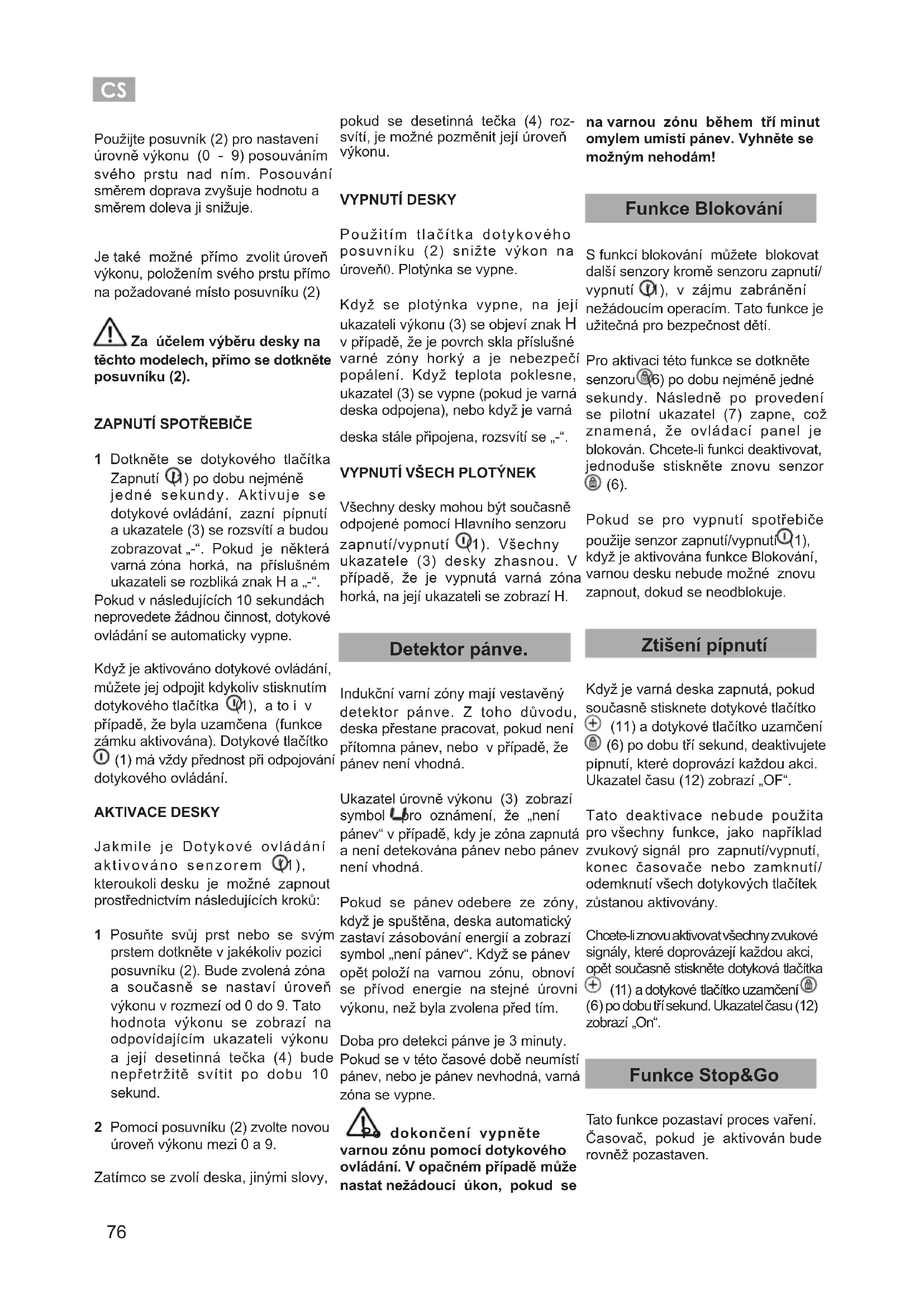 Všechny desky mohou být současně odpojené pomocí Hlavního senzoru zapnutí/vypnutí (1). Všechny ukazatele (3) desky zhasnou. V případě, že je vypnutá varná zóna horká, na její ukazateli se zobrazí H. Detektor pánve. Indukční varní zóny mají vestavěný detektor pánve. Z toho důvodu, deska přestane pracovat, pokud není přítomna pánev, nebo v případě, že pánev není vhodná. Ukazatel úrovně výkonu (3) zobrazí symbol pro oznámení, že „není pánev“ v případě, kdy je zóna zapnutá a není detekována pánev nebo pánev není vhodná. Pokud se pánev odebere ze zóny, když je spuštěna, deska automatický zastaví zásobování energií a zobrazí symbol „není pánev“. Když se pánev opět položí na varnou zónu, obnoví se přívod energie na stejné úrovni výkonu, než byla zvolena před tím. Doba pro detekci pánve je 3 minuty. Pokud se v této časové době neumístí pánev, nebo je pánev nevhodná, varná zóna se vypne. Po dokončení vypněte varnou zónu pomocí dotykového ovládání. V opačném případě může nastat nežádoucí úkon, pokud se na varnou zónu během tří minut omylem umístí pánev. Vyhněte se možným nehodám! Funkce Blokování S funkcí blokování můžete blokovat další senzory kromě senzoru zapnutí/ vypnutí (1), v zájmu zabránění nežádoucím operacím. Tato funkce je užitečná pro bezpečnost dětí. Pro aktivaci této funkce se dotkněte senzoru (6) po dobu nejméně jedné sekundy. Následně po provedení se pilotní ukazatel (7) zapne, což znamená, že ovládací panel je blokován. Chcete-li funkci deaktivovat, jednoduše stiskněte znovu senzor (6). Pokud se pro vypnutí spotřebiče použije senzor zapnutí/vypnutí (1), když je aktivována funkce Blokování, varnou desku nebude možné znovu zapnout, dokud se neodblokuje. Ztišení pípnutí Když je varná deska zapnutá, pokud současně stisknete dotykové tlačítko (11) a dotykové tlačítko uzamčení (6) po dobu tří sekund, deaktivujete pípnutí, které doprovází každou akci. Ukazatel času (12) zobrazí „OF“. Tato deaktivace nebude použita pro všechny funkce, jako například zvukový signál pro zapnutí/vypnutí, konec časovače nebo zamknutí/ odemknutí všech dotykových tlačítek zůstanou aktivovány. Chcete-li znovu aktivovat všechny zvukové signály, které doprovázejí každou akci, opět současně stiskněte dotyková tlačítka (11) a dotykové tlačítko uzamčení (6) po dobu tří sekund. Ukazatel času (12) zobrazí „On“. Funkce Stop&Go Tato funkce pozastaví proces vaření. Časovač, pokud je aktivován bude rovněž pozastaven.CS