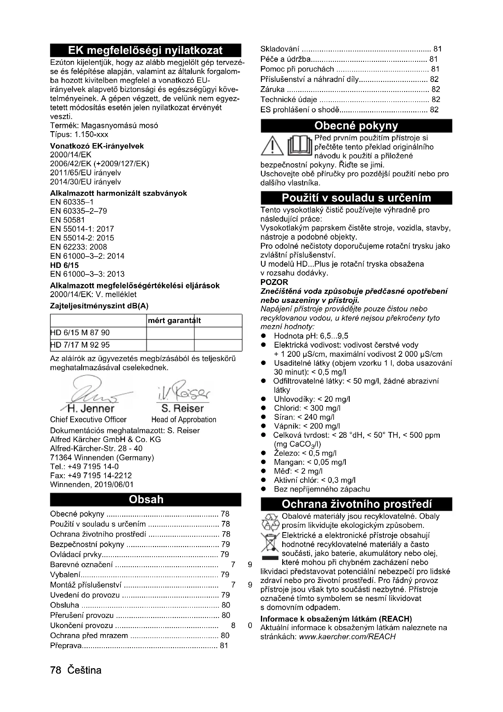 - /l) Železo: < 0,5 mg/l Mangan: < 0,05 mg/l Měď: < 2 mg/l Aktivní chlór: < 0,3 mg/l Bez nepříjemného zápachu Ochrana životního prostředí Obalové materiály jsou recyklovatelné. Obaly prosím likvidujte ekologickým způsobem. Elektrické a elektronické přístroje obsahují hodnotné recyklovatelné materiály a často součásti, jako baterie, akumulátory nebo olej, které mohou při chybném zacházení nebo likvidaci představovat potenciální nebezpečí pro lidské zdraví nebo pro životní prostředí. Pro řádný provoz přístroje jsou však tyto součásti nezbytné. Přístroje označené tímto symbolem se nesmí likvidovat s domovním odpadem. Informace k obsaženým látkám (REACH) Aktuální informace k obsaženým látkám naleznete na stránkách: www.kaercher.com/REACH mért garantált HD 6/15 M 87 90 HD 7/17 M 92 95 Obecné pokyny p. 78