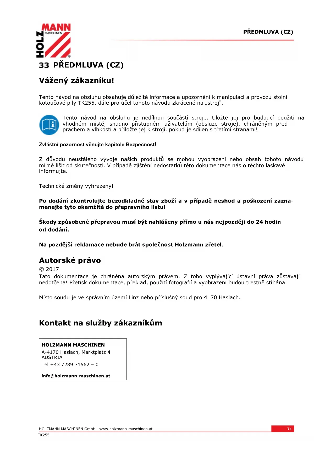 Po uplynuti zaručni doby mohou byt opravy realizovány i u neautorizovanych servisnich firem. K dispozici je Vám samozřejme i nadále servis společnosti HOLZMANN-Maschinen. V takovém pripadě uplatnéte Vaše nezávezné pop-távy/reklamace s udaji dle bodu C) na nás zákaznický servis nebo nám poslete vyplnény priloženy servisi formular.