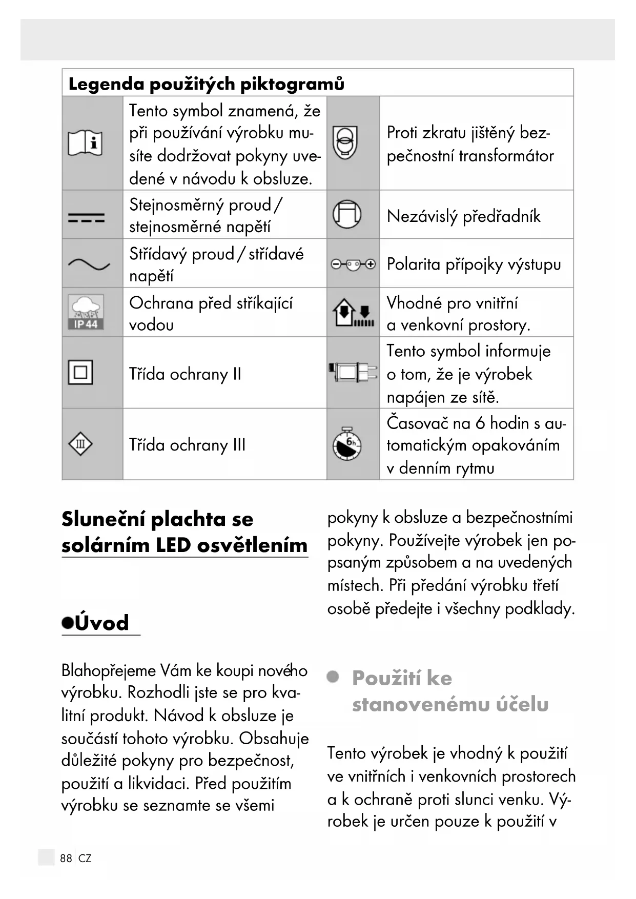 Serwis Serwis Polska Tel.: 008004911946 E-Mail: owim@lidl.pl87 CZ Legenda použitých piktogramů ...................................Strana 88 Úvod ........................................................................................Strana 88 Použití ke stanovenému účelu ................................................Strana 88 Popis dílů .................................................................................Strana 89 Technická data .......................................................................Strana 89 Obsah dodávky .....................................................................Strana 90 Bezpečnostní upozornění ...............................................Strana 90 Bezpečnostní pokyny pro baterie a akumulátory ................Strana 92 Vložení akumulátoru a jeho výměna ........................ Strana 94 Montáž ....................................................................................Strana 94 Montáž výrobku ..................................................................... Strana 95 Používání ...............................................................................Strana 96 Funkce časovače (jen při použití se síťovým adaptérem) ......................................................... Strana 97 Demontáž výrobku ...........................................................Strana 97 Čistění a ošetřování ...........................................................Strana 98 Odstranění poruch (při používání se solárním panelem) .......................................................Strana 98 Zlikvidování .........................................................................Strana 99 Záruka ....................................................................................Strana 100 Postup v případě uplatňování záruky ...................................Strana 100 Servis ....................................................................................... Strana 10188 CZ Legenda použitých piktogramů Tento symbol znamená, že při používání výrobku mu- síte dodržovat pokyny uve- dené vnávodu kobsluze. Proti zkratu jištěný bez- pečnostní transformátor Stejnosměrný proud / stejnosměrné napětí Nezávislý předřadník Střídavý proud / střídavé napětí Polarita přípojky výstupu Ochrana před stříkající vodou Vhodné pro vnitřní a venkovní prostory. Třída ochrany II Tento symbol informuje otom, že je výrobek napájen ze sítě. Třída ochrany III Časovač na 6hodin sau- tomatickým opakováním vdenním rytmu Sluneční plachta se solárním LED osvětlením Úvod Blahopřejeme Vám ke koupi nové