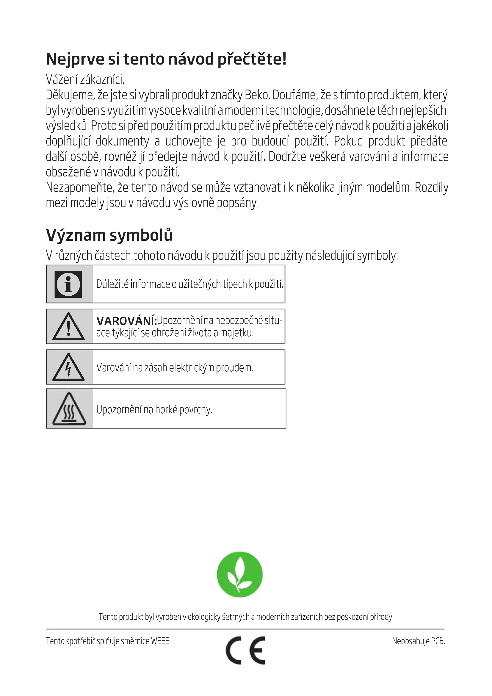- Tak opakuj okap, żeby sę ne uszkodzł w trans- porce.Tento produkt byl vyroben v ekologicky šetrných a moderních zařízeních bez poškození přírody.Tento spotřebič splňuje směrnice WEEE.Neobsahuje PCB. Nejprve si tento návod přečtěte! Vážení zákazníci, Děkujeme, že jste si vybrali produkt značky Beko. Doufáme, že s tímto produktem, který byl vyroben s využitím vysoce kvalitní a moderní technologie, dosáhnete těch nejlepších výsledků. Proto si před použitím produktu pečlivě přečtěte celý návod k použití a jakékoli doplňující dokumenty a uchovejte je pro budoucí použití. Pokud produkt předáte další osobě, rovněž jí předejte návod k použití. Dodržte veškerá varování a informace obsažené v návodu k použití. Nezapomeňte, že tento návod se může vztahovat i k několika jiným modelům. Rozdíly mezi modely jsou v návodu výslovně popsány. Význam symbolů V různých částech tohoto návodu k použití jsou použity následující symboly: