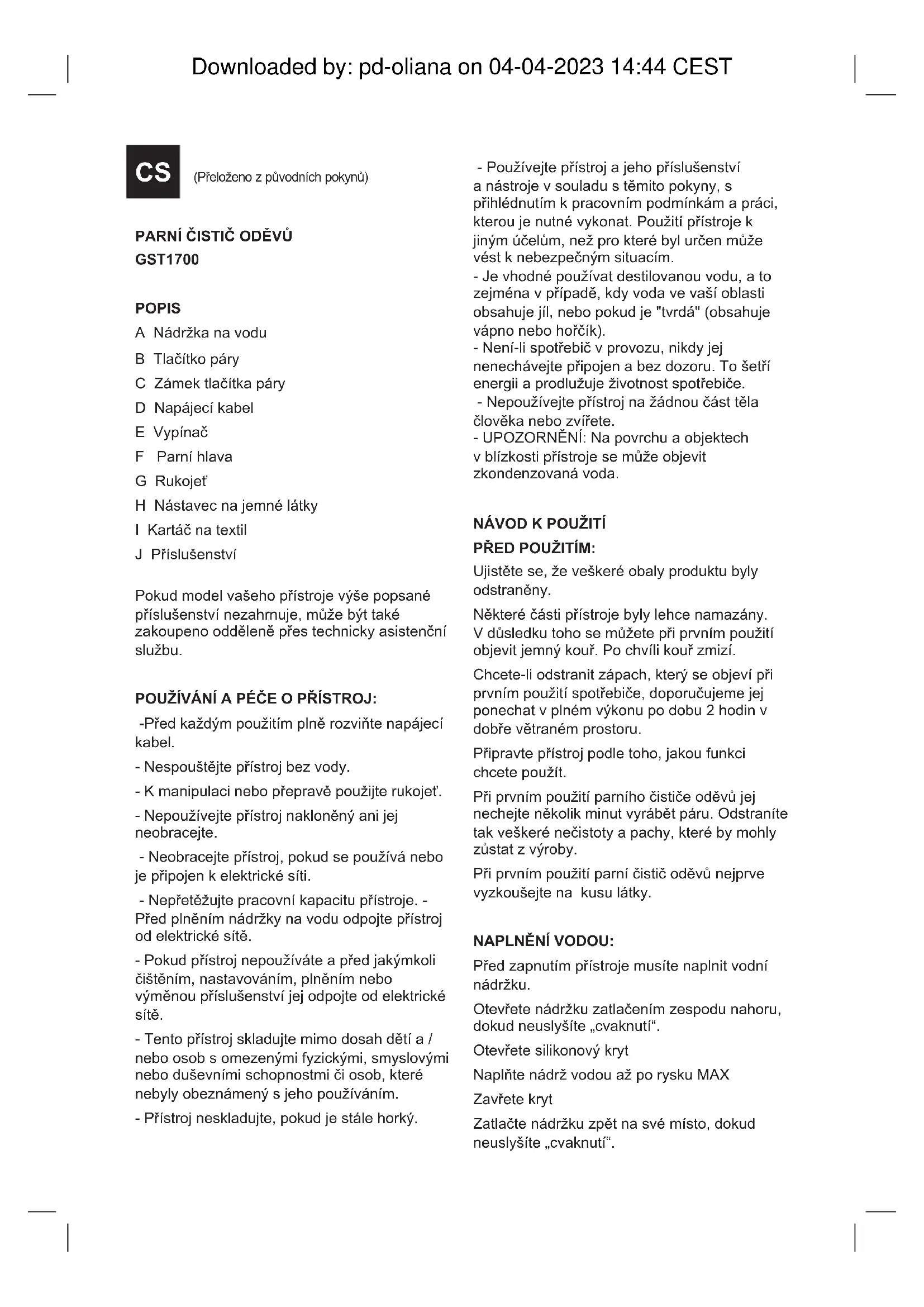 GST1700 POPIS A Nádržka na vodu B Tlačítko páry C Zámek tlačítka páry D Napájecí kabel E Vypínač F Parní hlava G Rukojeť H Nástavec na jemné látky I Kartáč na textil J Příslušenství Pokud model vašeho přístroje výše popsané příslušenství nezahrnuje, může být také zakoupeno odděleně přes technicky asistenční službu. POUŽÍVÁNÍ A PÉČE O PŘÍSTROJ: -Před každým použitím plně rozviňte napájecí kabel. - Nespouštějte přístroj bez vody. - K manipulaci nebo přepravě použijte rukojeť. - Nepoužívejte přístroj nakloněný ani jej neobracejte. - Neobracejte přístroj, pokud se používá nebo je připojen k elektrické síti. - Nepřetěžujte pracovní kapacitu přístroje. - Před plněním nádržky na vodu odpojte přístroj od elektrické sítě. - Pokud přístroj nepoužíváte a před jakýmkoli čištěním, nastavováním, plněním nebo výměnou příslušenství jej odpojte od elektrické sítě. - Tento přístroj skladujte mimo dosah dětí a / nebo osob s omezenými fyzickými, smyslovými nebo duševními schopnostmi či osob, které nebyly obeznámený s jeho používáním. - Přístroj neskladujte, pokud je stále horký. - Používejte přístroj a jeho příslušenství a nástroje v souladu s těmito pokyny, s přihlédnutím k pracovním podmínkám a práci, kterou je nutné vykonat. Použití přístroje k jiným účelům, než pro které byl určen může vést k nebezpečným situacím. - Je vhodné používat destilovanou vodu, a to zejména v případě, kdy voda ve vaší oblasti obsahuje jíl, nebo pokud je "tvrdá" (obsahuje vápno nebo hořčík). - Není-li spotřebič v provozu, nikdy jej nenechávejte připojen a bez dozoru. To šetří energii a prodlužuje životnost spotřebiče. - Nepoužívejte přístroj na žádnou část těla člověka nebo zvířete. - UPOZORNĚNÍ: Na povrchu a objektech v blízkosti přístroje se může objevit zkondenzovaná voda.