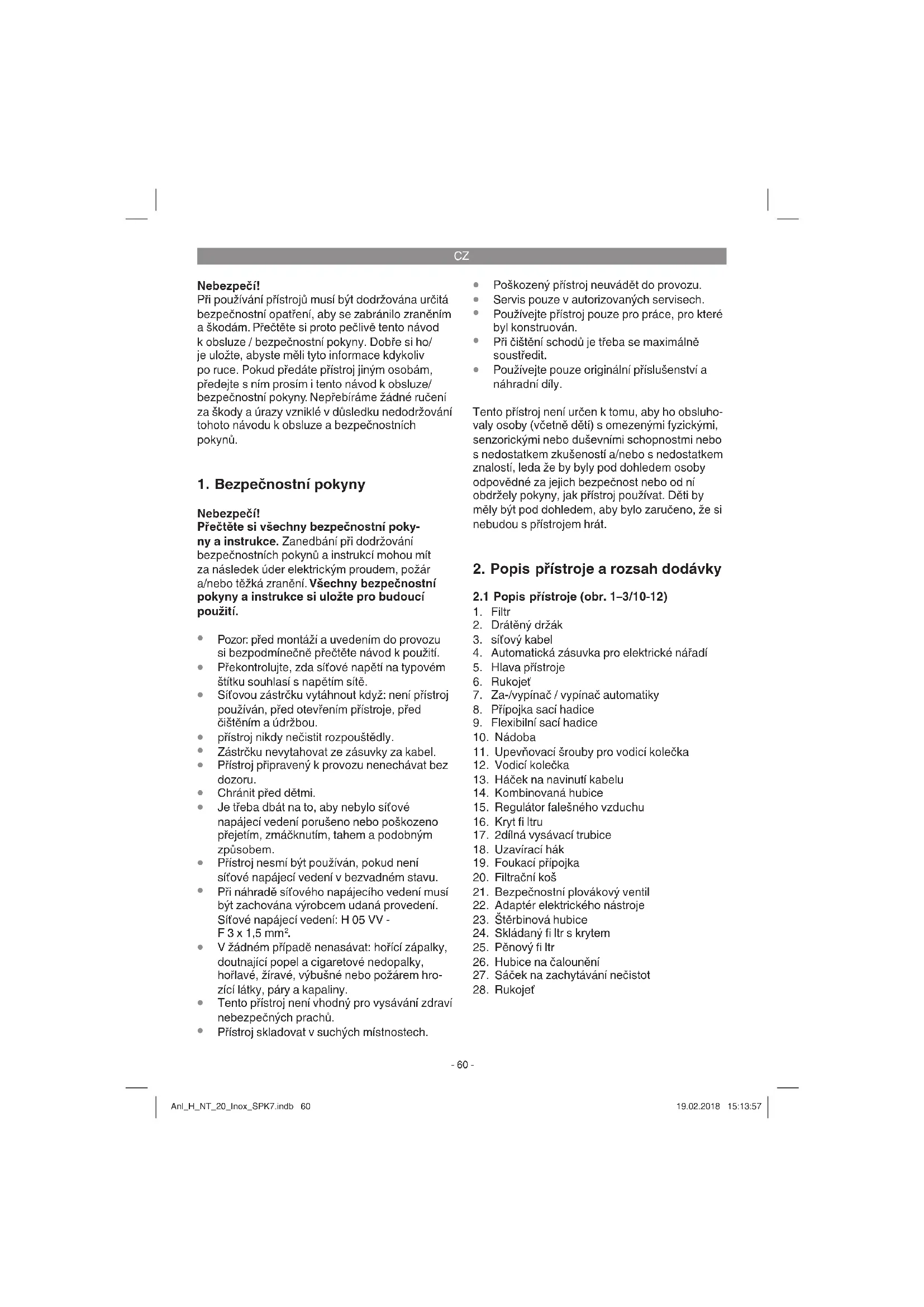 Montáž vodicích koleček (obr. 4/12) Vodicí kolečka (12) namontujte podle obrázku 4. Montáž drátěného držáku pro navíjení kabelu a sací hadice (obr. 5/2) Drátěný držák pro navíjení kabelu a sací hadice namontujte tak, jak je znázorněno na obr. 5. Po použití lze kabel a sací hadici navinout na drátěný držák. Montáž hlavy přístroje (obr. 6) Hlava přístroje (5) je na nádobě (10) připevněna pomocí uzavíracích háků (18). K sejmutí hlavy přístroje (5) uzavírací háky (18) otevřít a hlavu přístroje (5) sejmout. Při montáži hlavy přístroje (5) dbát na správné zacvaknutí uzavíracích háků (18). Anl_H_NT_20_Inox_SPK7.indb 61Anl_H_NT_20_Inox_SPK7.indb 61 19.02.2018 15:13:5719.02.2018 15:13:57CZ