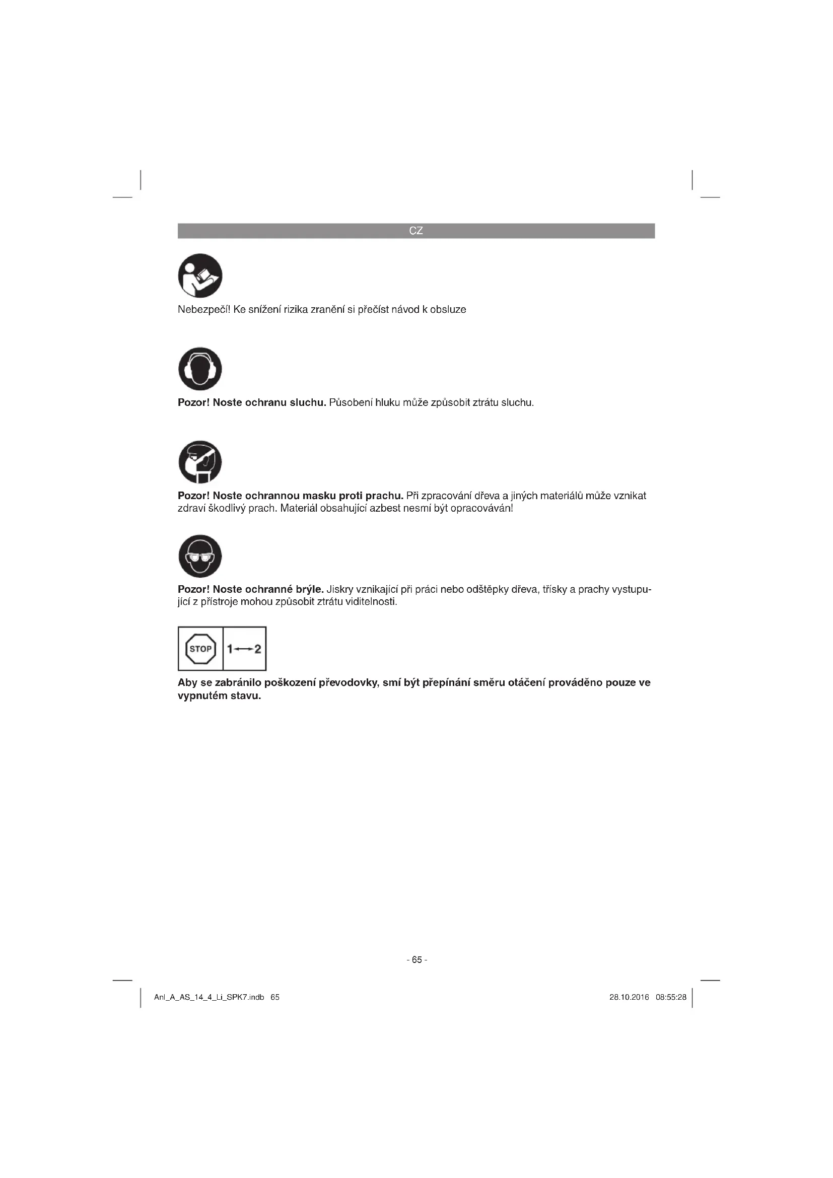 Nebezpečí! Ke snížení rizika zranění si přečíst návod k obsluze Pozor! Noste ochranu sluchu. Působení hluku může způsobit ztrátu sluchu. Pozor! Noste ochranné brýle. Jiskry vznikající při práci nebo odštěpky dřeva, třísky a prachy vystupu- jící z přístroje mohou způsobit ztrátu viditelnosti. Pozor! Noste ochrannou masku proti prachu. Při zpracování dřeva a jiných materiálů může vznikat zdraví škodlivý prach. Materiál obsahující azbest nesmí být opracováván! Aby se zabránilo poškození převodovky, smí být přepínání směru otáčení prováděno pouze ve vypnutém stavu. Anl_A_AS_14_4_Li_SPK7.indb 65Anl_A_AS_14_4_Li_SPK7.indb 65 28.10.2016 08:55:2828.10.2016 08:55:28CZ