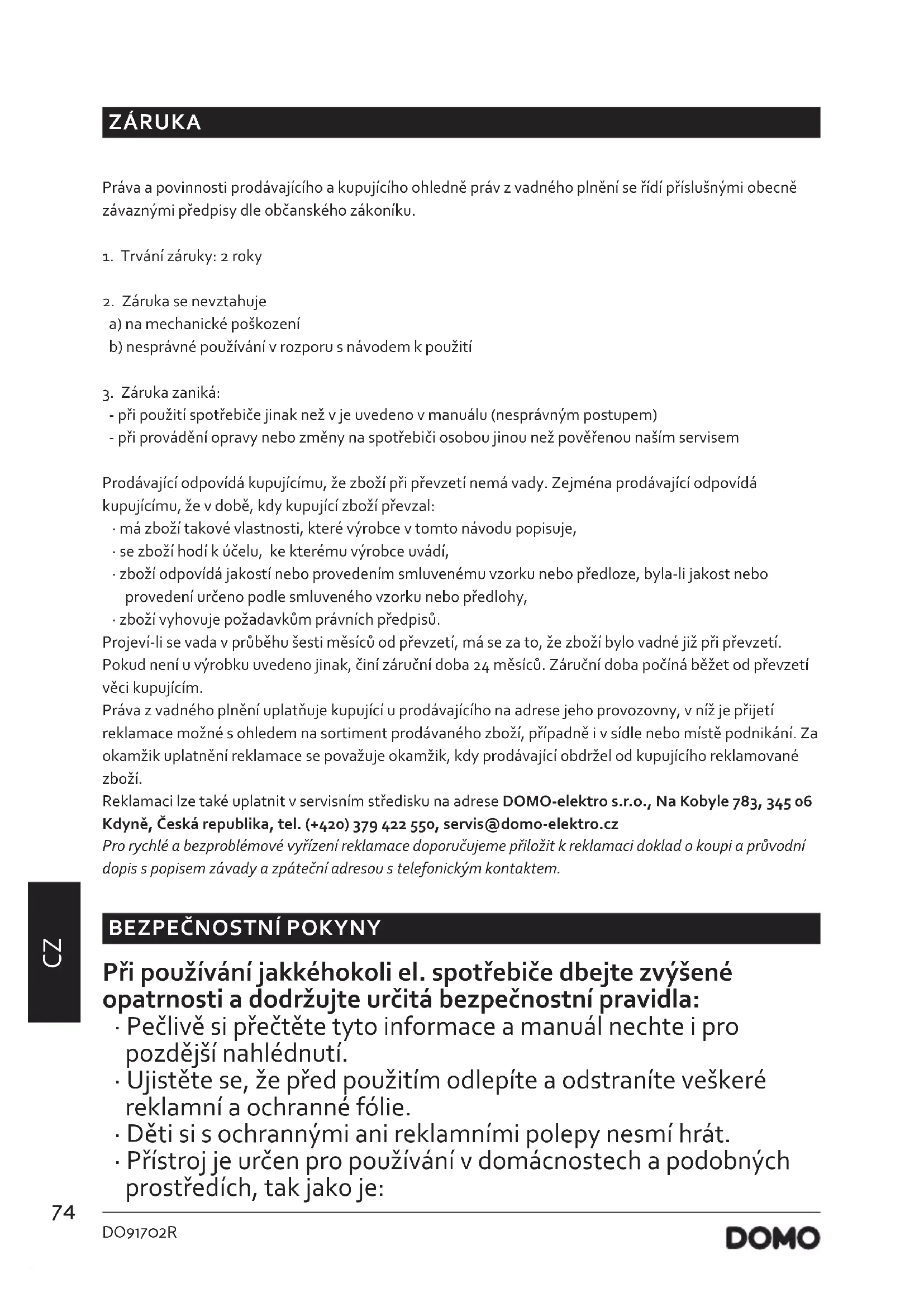 Reklamaci lze také uplatnit v servisinim středisku na adrese DOMO-elektro s.r.o., Na Kobyle 783, 345 o6 Kdyně, Česká republica, tel. (+420) 379 422 550, servis@domo-elektro.cz