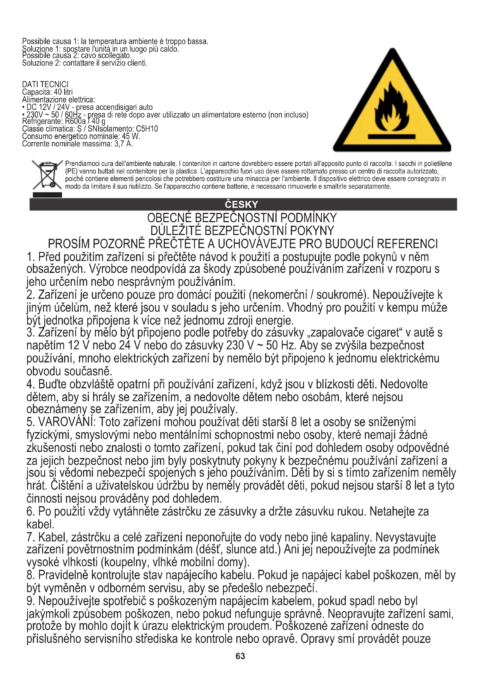 jakýmkoli způsobem poškozen, nebo pokud nefunguje správně. Neopravujte zařízení sami, protože by mohlo dojít k úrazu elektrickým proudem. Poškozené zařízení odneste do příslušného servisního střediska ke kontrole nebo opravě. Opravy smí provádět pouze Possibile causa 1: la temperatura ambiente è troppo bassa. Soluzione 1: spostare l'unità in un luogo più caldo. Possibile causa 2: cavo scollegato. Soluzione 2: contattare il servizio clienti. DATI TECNICI Capacità: 40 litri Alimentazione elettrica: