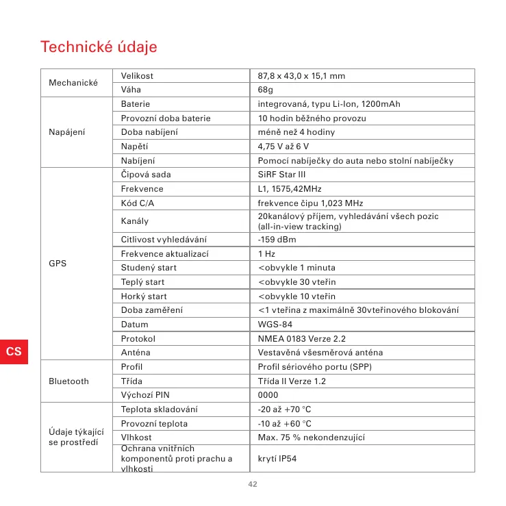 Bluetooth Údaje týkající se prostředí Velikost 87,8 x 43,0 x 15,1 mm Váha 68g Baterie integrovaná, typu Li-Ion, 1200mAh Provozní doba baterie 10 hodin běžného provozu Doba nabíjení méně než 4 hodiny Napětí 4,75 V až 6 V Nabíjení Pomocí nabíječky do auta nebo stolní nabíječky Čipová sada SiRF Star III Frekvence L1, 1575,42MHz Kód C/A frekvence čipu 1,023 MHz Kanály 20kanálový příjem, vyhledávání všech pozic (all-in-view tracking) Citlivost vyhledávání -159 dBm Frekvence aktualizací 1 Hz Studený start <obvykle 1 minuta Teplý start <obvykle 30 vteřin Horký start <obvykle 10 vteřin Doba zaměření <1 vteřina z maximálně 30vteřinového blokování Datum WGS-84 Protokol NMEA 0183 Verze 2.2 Anténa Vestavěná všesměrová anténa Profil Profil sériového portu (SPP) Třída Třída II Verze 1.2 Výchozí PIN