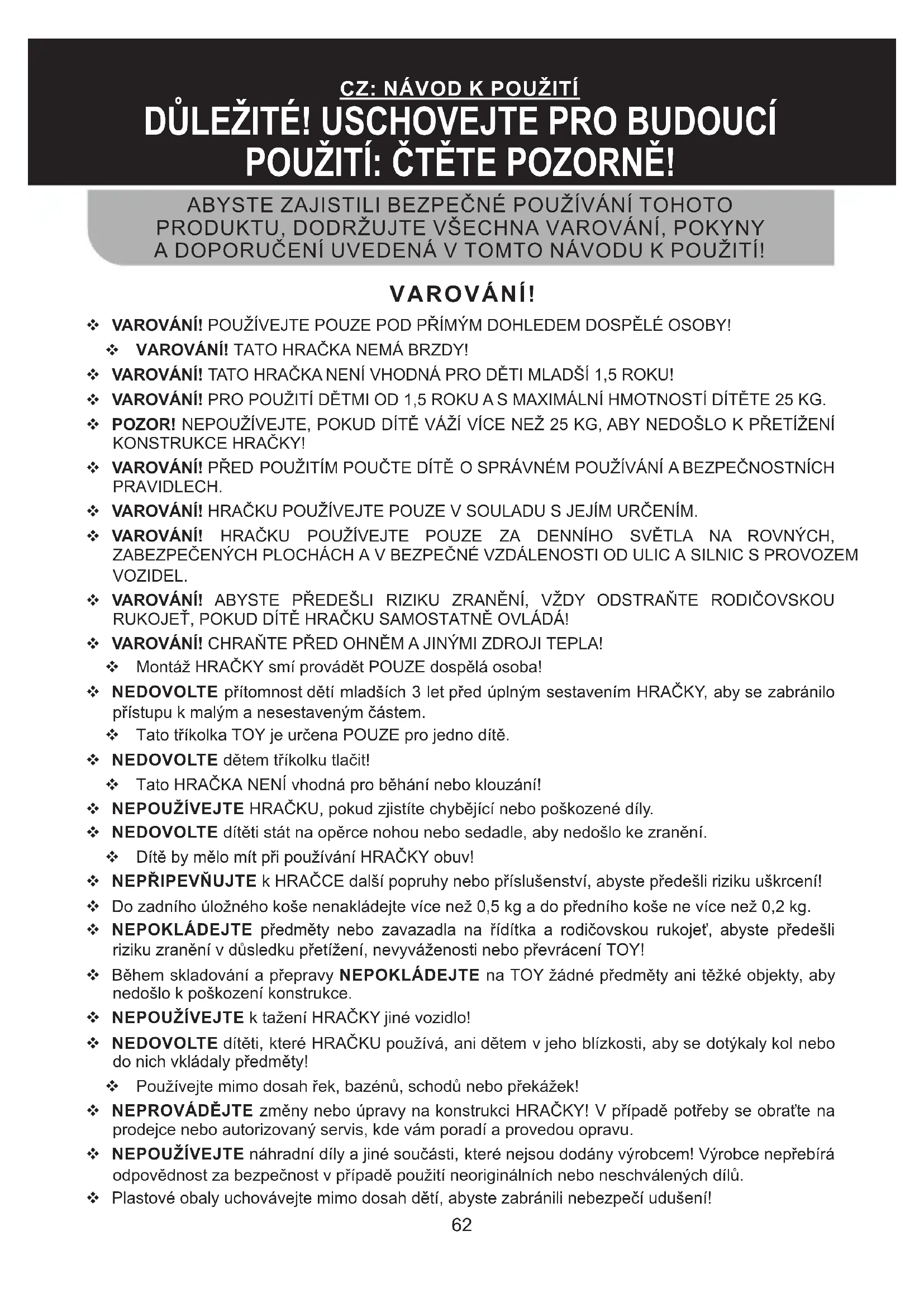 POUŽITÍ: ČTĚTE POZORNĚ! VAROVÁNÍ! VAROVÁNÍ! POUŽÍVEJTE POUZE POD PŘÍMÝM DOHLEDEM DOSPĚLÉ OSOBY! VAROVÁNÍ! TATO HRAČKA NEMÁ BRZDY! VAROVÁNÍ! TATO HRAČKA NENÍ VHODNÁ PRO DĚTI MLADŠÍ 1,5 ROKU! VAROVÁNÍ! PRO POUŽITÍ DĚTMI OD 1,5 ROKU A S MAXIMÁLNÍ HMOTNOSTÍ DÍTĚTE 25 KG. POZOR! NEPOUŽÍVEJTE, POKUD DÍTĚ VÁŽÍ VÍCE NEŽ 25 KG, ABY NEDOŠLO K PŘETÍŽENÍ KONSTRUKCE HRAČKY! VAROVÁNÍ! PŘED POUŽITÍM POUČTE DÍTĚ O SPRÁVNÉM POUŽÍVÁNÍ A BEZPEČNOSTNÍCH PRAVIDLECH. VAROVÁNÍ! HRAČKU POUŽÍVEJTE POUZE V SOULADU S JEJÍM URČENÍM. VAROVÁNÍ! HRAČKU POUŽÍVEJTE POUZE ZA DENNÍHO SVĚTLA NA ROVNÝCH, ZABEZPEČENÝCH PLOCHÁCH A V BEZPEČNÉ VZDÁLENOSTI OD ULIC A SILNIC S PROVOZEM VOZIDEL. VAROVÁNÍ! ABYSTE PŘEDEŠLI RIZIKU ZRANĚNÍ, VŽDY ODSTRAŇTE RODIČOVSKOU RUKOJEŤ, POKUD DÍTĚ HRAČKU SAMOSTATNĚ OVLÁDÁ! VAROVÁNÍ! CHRAŇTE PŘED OHNĚM A JINÝMI ZDROJI TEPLA! Montáž HRAČKY smí provádět POUZE dospělá osoba! NEDOVOLTE přítomnost dětí mladších 3 let před úplným sestavením HRAČKY, aby se zabránilo přístupu k malým a nesestaveným částem. Tato tříkolka TOY je určena POUZE pro jedno dítě. NEDOVOLTE dětem tříkolku tlačit! Tato HRAČKA NENÍ vhodná pro běhání nebo klouzání! NEPOUŽÍVEJTE HRAČKU, pokud zjistíte chybějící nebo poškozené díly. NEDOVOLTE dítěti stát na opěrce nohou nebo sedadle, aby nedošlo ke zranění. Dítě by mělo mít při používání HRAČKY obuv! NEPŘIPEVŇUJTE k HRAČCE další popruhy nebo příslušenství, abyste předešli riziku uškrcení! Do zadního úložného koše nenakládejte více než 0,5 kg a do předního koše ne více než 0,2 kg. NEPOKLÁDEJTE předměty nebo zavazadla na řídítka a rodičovskou rukojeť, abyste předešli riziku zranění v důsledku přetížení, nevyváženosti nebo převrácení TOY! Během skladování a přepravy NEPOKLÁDEJTE na TOY žádné předměty ani těžké objekty, aby nedošlo k poškození konstrukce. NEPOUŽÍVEJTE k tažení HRAČKY jiné vozidlo! NEDOVOLTE dítěti, které HRAČKU používá, ani dětem v jeho blízkosti, aby se dotýkaly kol nebo do nich vkládaly předměty! Používejte mimo dosah řek, bazénů, schodů nebo překážek! NEPROVÁDĚJTE změny nebo úpravy na konstrukci HRAČKY! V případě potřeby se obraťte na prodejce nebo autorizovaný servis, kde vám poradí a provedou opravu. NEPOUŽÍVEJTE náhradní díly a jiné součásti, které nejsou dodány výrobcem! Výrobce nepřebírá odpovědnost za bezpečnost v případě použití neoriginálních nebo neschválených dílů. Plastové obaly uchovávejte mimo dosah dětí, abyste zabránili nebezpečí udušení!