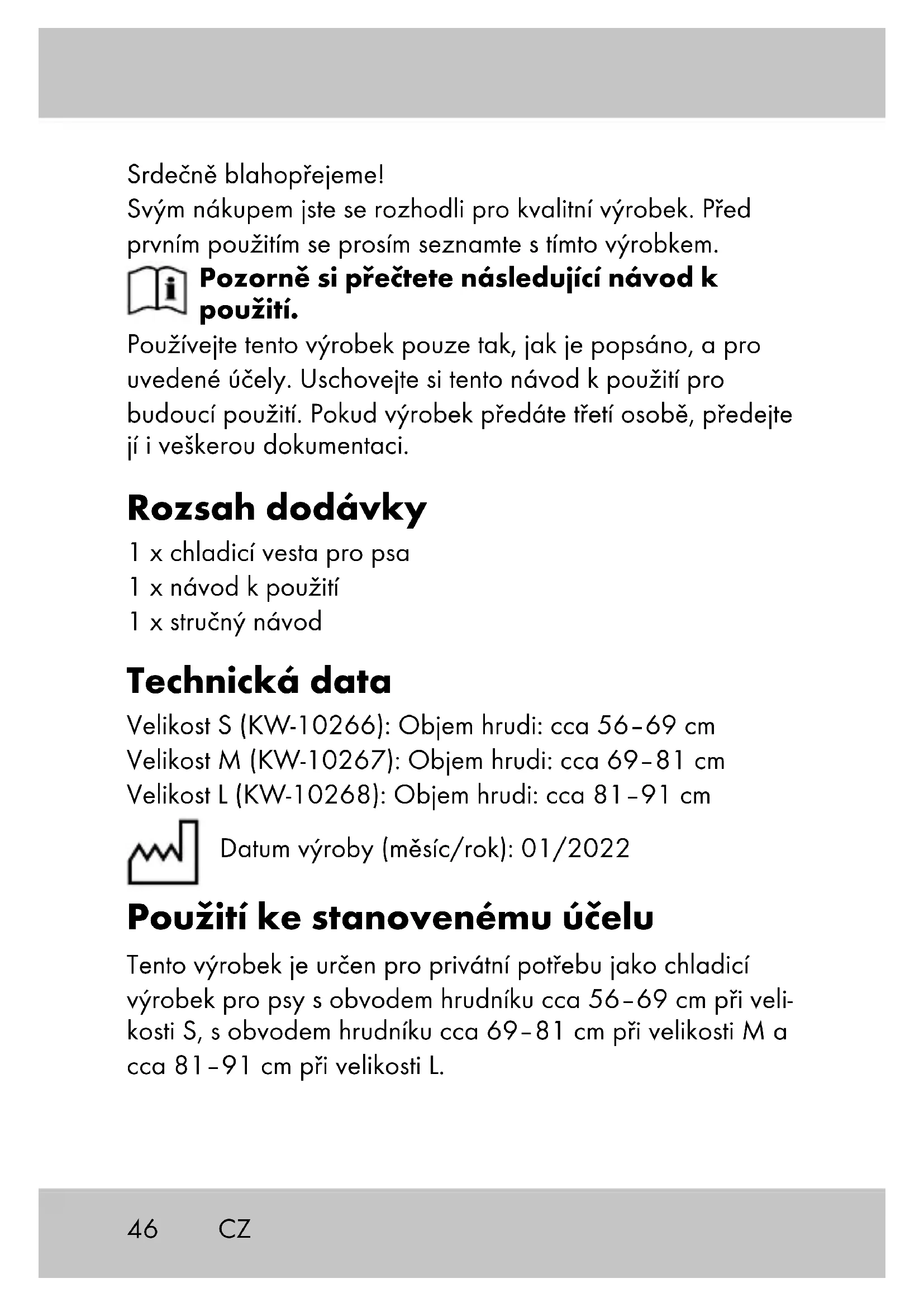CZ51CZ Uskladnění, čištění Z důvodu funkčnosti je nutné výrobek pravidelně mechanicky čistit. Pokud výrobek nepoužíváte, skladujte jej vždy suchý a čistý při pokojové teplotě. Při lehkém znečistění čistěte vodou a návazně vytřete do sucha hadříkem. DŮLEŽITÉ! K čištění nikdy nepoužívejte agresivní čisticí prostředky. Během nebo po onemocnění zvířete musí být výrobek dezin- fikován. Měli byste se poradit s důvěryhodným veterinářem a zeptat se na vhodné hygienické a dezinfekční prostředky. Pokyny k likvidaci Výrobek a obalový materiál likvidujte do odpadu podle aktuálních místních předpisů. Obalový materiál, jako např. fóliové sáčky, nepatří do dětských rukou. Obalový materiál uchovávejte z dosahu dětí. Zlikvidujte produkty a balení ekologicky. Recyklační kód identifikuje různé materiály pro recyklaci. Kód se skládá z recyklačního symbolu - který indikuje recyklační cyklus - a čísla identifikujícího materiál.52 Pokyny k záruce a průběhu služby Výrobek byl vyroben s velkou péčí a za stálé kontroly. DELTA-SPORT HANDELSKONTOR GmbH poskytuje koncovým privátním zákazníkům na tento výrobek tři roky záruky od data nákupu (záruční lhůta) podle následující ustanovení. Záruka se týká pouze vad materiálu a závad ve zpracování. Záruka se nevztahuje na díly, které podléhají normálnímu opotřebení, a proto je nutné na ně pohlížet jako na rychle opotřebitelné díly (např. baterie), a na křehké díly, např. vypínače, akumulátory nebo díly vyrobené ze skla. Nároky z této záruky jsou vyloučeny, pokud výrobek byl po- užíván neodborně nebo nedovoleným způsobem nebo nikoli v rámci stanoveného účelu určení nebo předpokládaného rozsahu používání nebo nebyla dodržena zadání v návodu k obsluze, ledaže by koncový zákazník prokázal, že existuje vada materiálu nebo došlo k chybě ve zpracování, které nevyplývají z některé výše uvedených okolností. Nároky ze záruky lze uplatnit pouze v rámci záruční lhůty po předložení originálního pokladního dokladu. Proto si pro- sím uschovejte originál pokladního dokladu. Doba záruky se neprodlužuje případnými opravami na základě záruky, zákonné záruky nebo kulance. Totéž platí také pro vyměně- né a opravené díly. CZ53CZ Při reklamacích se prosím obracejte na níže uvedenou horkou linku servisu nebo se s námi spojte e-mailem. Pokud se vyskytne případ reklamace, výrobek Vám – dle naší volby – bezplatně opravíme, vyměníme nebo Vám vrátíme kupní cenu. Další práva ze záruky nevznikají. Vaše zákonná práva, zejména nároky na zajištění záruky vůči konkrétnímu prodejci, nejsou touto zárukou omezena. IAN: 389124_2107 Servis Česko Tel.: 800143873 E-Mail: deltasport@lidl.cz54 Blahoželáme! Svojím nákupom ste sa rozhodli pre kvalitný výrobok. Pred prvým použitím sa s výrobkom dôkladne oboznámte. Pozorne si prečítajte tento návod na použi- vanie. Výrobok používajte len uvedeným spôsobom a na uvedený účel. Tento návod na použivanie si dobre uschovajte. Pri odovzdávaní výrobku tretej osobe odovzdajte s výrobkom aj všetky podklady. Obsah balenia 1 x chladiaca vesta pre psa 1 x návod na používanie 1 x krátky návod Technické údaje Veľkosť S (KW-10266): Obvod hrudníka: cca 56–69 cm Veľkosť M (KW-10267): Obvod hrudníka: cca 69–81 cm Veľkosť L (KW-10268): Obvod hrudníka: cca 81–91 cm Dátum výroby (mesiac/rok): 01/2022 Používanie podľa určenia Tento výrobok je určený ako chladiaci výrobok pre psov s ob- vodom hrudníka cca 56–69 cm pri veľkosti S, cca 69–81 cm obvodu hrudníka pri veľkosti M a cca 81–91 cm obvodu hrudníka pri veľkosti L pre súkromné používanie. SK55 Bezpečnostné pokyny Nebezpečenstvo poranenia!