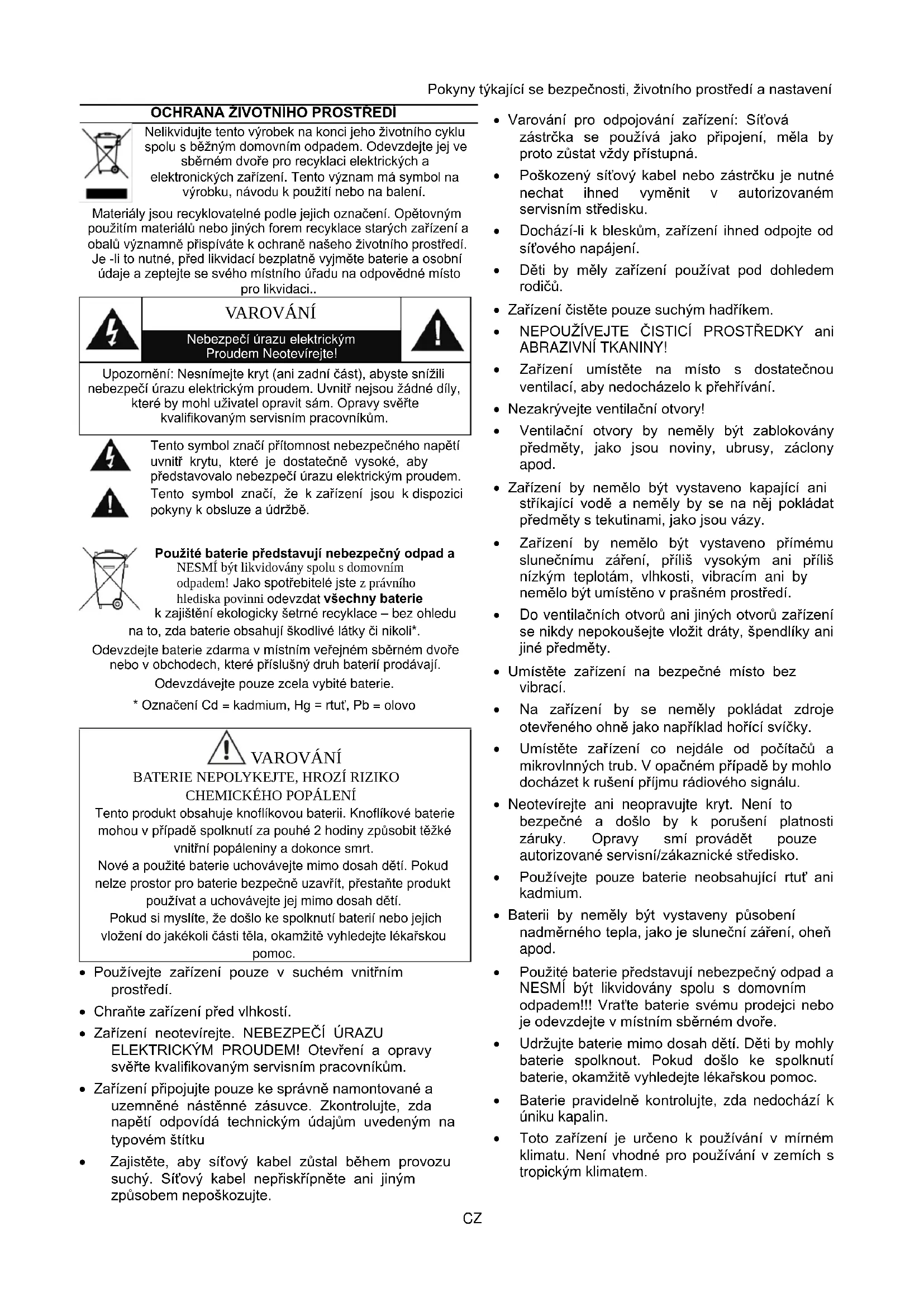 - Použité baterie představují nebezpečný odpad a NESMÍ být likvidovány spolu s domovním odpadem!!! Vraťte baterie svému prodejci nebo je odevzdejte v místním sběrném dvoře.