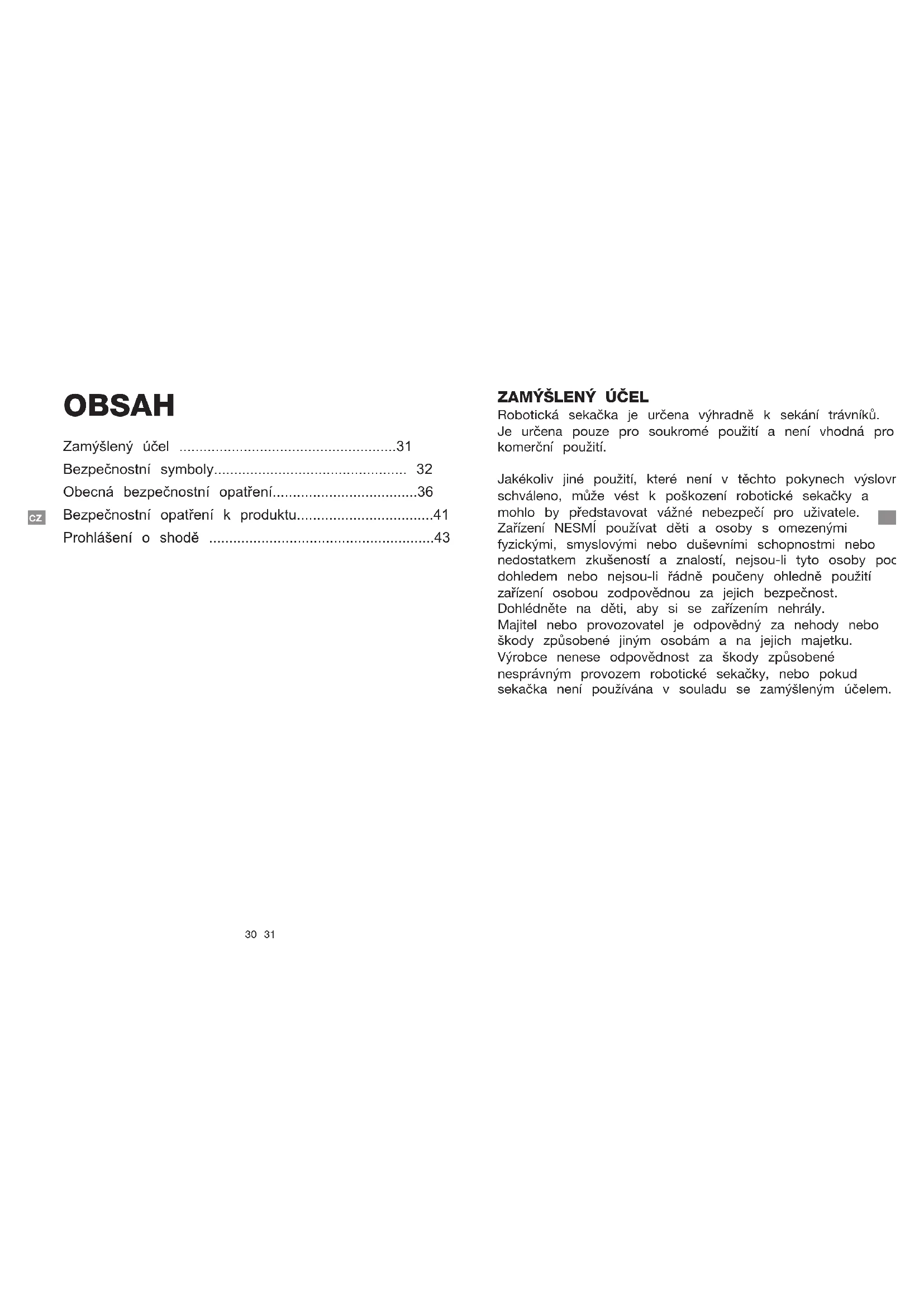 Robotická sekačka je určena výhradně k sekání trávníků. Je určena pouze pro soukromé použití a není vhodná pro komerční použití. Jakékoliv jiné použití, které není v těchto pokynech výslovně schváleno, může vést k poškození robotické sekačky a mohlo by představovat vážné nebezpečí pro uživatele. Zařízení NESMÍ používat děti a osoby s omezenými fyzickými, smyslovými nebo duševními schopnostmi nebo nedostatkem zkušeností a znalostí, nejsou-li tyto osoby pod dohledem nebo nejsou-li řádně poučeny ohledně použití zařízení osobou zodpovědnou za jejich bezpečnost. Dohlédněte na děti, aby si se zařízením nehrály. Majitel nebo provozovatel je odpovědný za nehody nebo škody způsobené jiným osobám a na jejich majetku. Výrobce nenese odpovědnost za škody způsobené nesprávným provozem robotické sekačky, nebo pokud sekačka není používána v souladu se zamýšleným účelem.32 33 CZ CZ