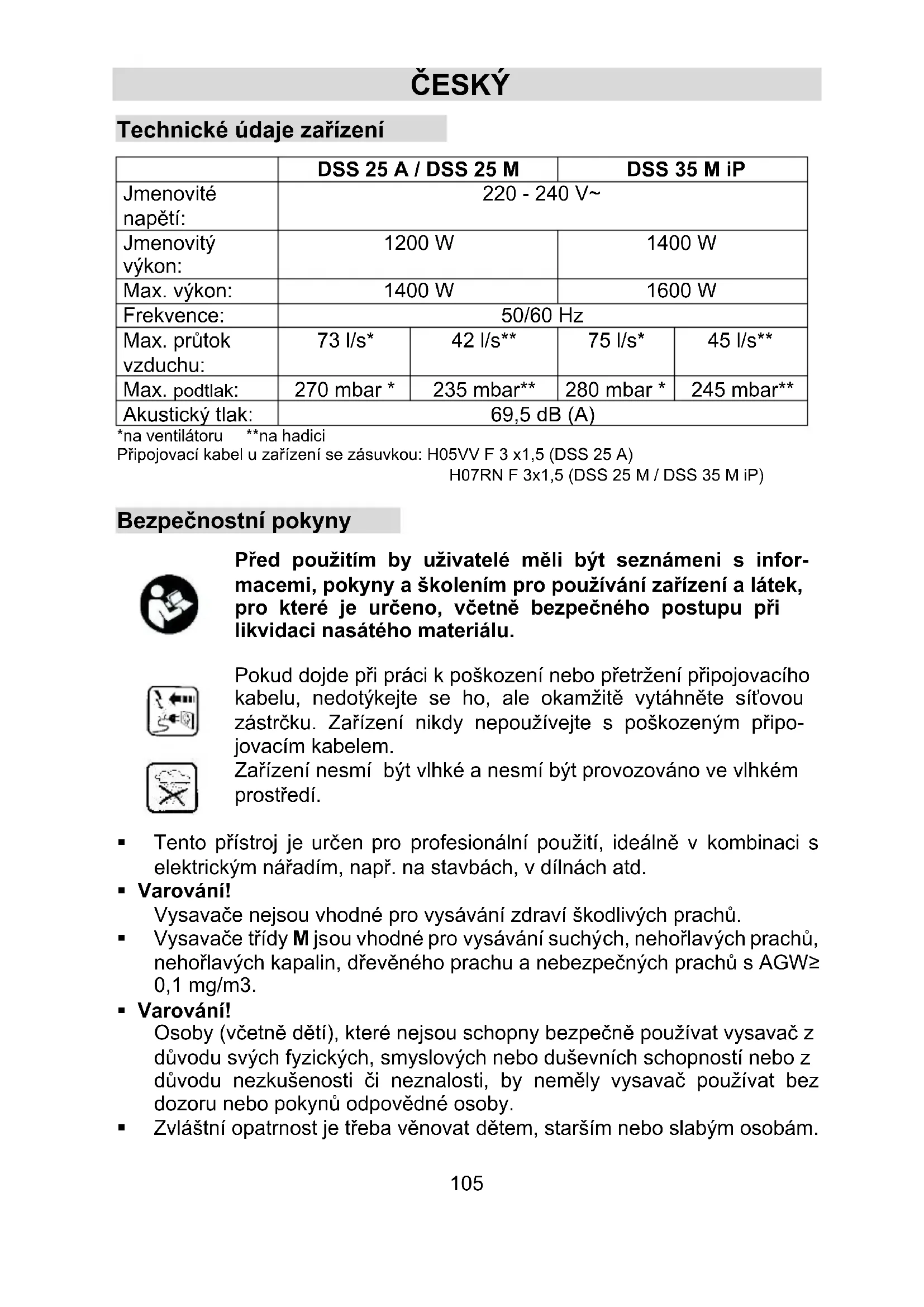Jmenovitý výkon: 1200 W 1400 W Max. výkon: 1400 W 1600 W Frekvence: 50/60 Hz Max. průtok vzduchu: 73 l/s* 42 l/s** 75 l/s* 45 l/s** Max. podtlak: 270 mbar * 235 mbar** 280 mbar * 245 mbar** Akustický tlak: 69,5 dB (A) *na ventilátoru **na hadici Připojovací kabel u zařízení se zásuvkou: H05VV F 3 x1,5 (DSS 25 A) H07RN F 3x1,5 (DSS 25 M / DSS 35 M iP) Bezpečnostní pokyny