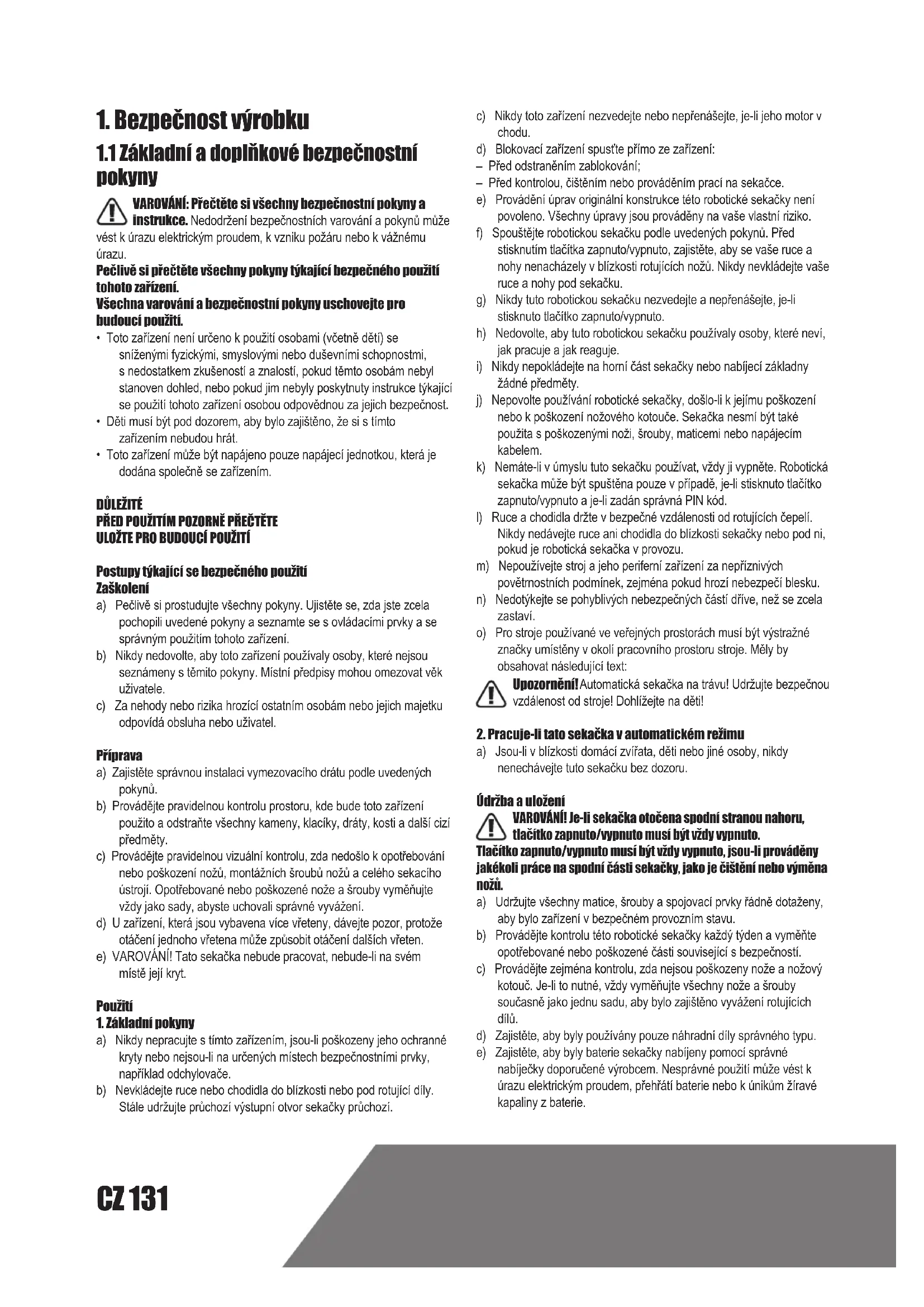 Postupy týkající se bezpečného použití Zaškolení a) Pečlivě si prostudujte všechny pokyny. Ujistěte se, zda jste zcela pochopili uvedené pokyny a seznamte se s ovládacími prvky a se správným použitím tohoto zařízení. b) Nikdy nedovolte, aby toto zařízení používaly osoby, které nejsou seznámeny s těmito pokyny. Místní předpisy mohou omezovat věk uživatele. c) Za nehody nebo rizika hrozící ostatním osobám nebo jejich majetku odpovídá obsluha nebo uživatel. Příprava a) Zajistěte správnou instalaci vymezovacího drátu podle uvedených pokynů. b) Provádějte pravidelnou kontrolu prostoru, kde bude toto zařízení použito a odstraňte všechny kameny, klacíky, dráty, kosti a další cizí předměty. c) Provádějte pravidelnou vizuální kontrolu, zda nedošlo k opotřebování nebo poškození nožů, montážních šroubů nožů a celého sekacího ústrojí. Opotřebované nebo poškozené nože a šrouby vyměňujte vždy jako sady, abyste uchovali správné vyvážení. d) U zařízení, která jsou vybavena více vřeteny, dávejte pozor, protože otáčení jednoho vřetena může způsobit otáčení dalších vřeten. e) VAROVÁNÍ! Tato sekačka nebude pracovat, nebude-li na svém místě její kryt. Použití