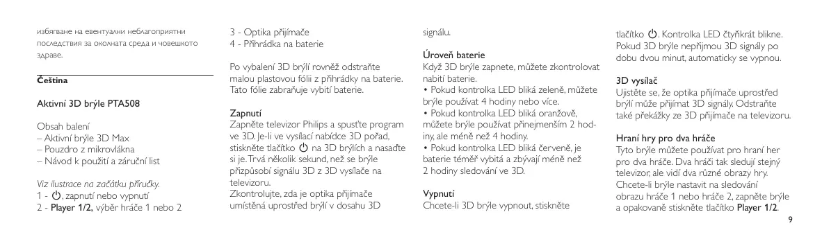 • Los padres deben supervisar a sus hijos mientras miran contenido 3D y cerciorarse de que no sufran ninguno de los malestares antes mencionados. Se recomienda que los menores de 6 años no vean imágenes en 25 Voir les illustrations au début du manuel. 1 - A, Bouton marche/arrêt 2 - Player 1/2, sélection du joueur 1 ou du joueur 2 3 - Objectif du récepteur 4 - Compartiment à pile