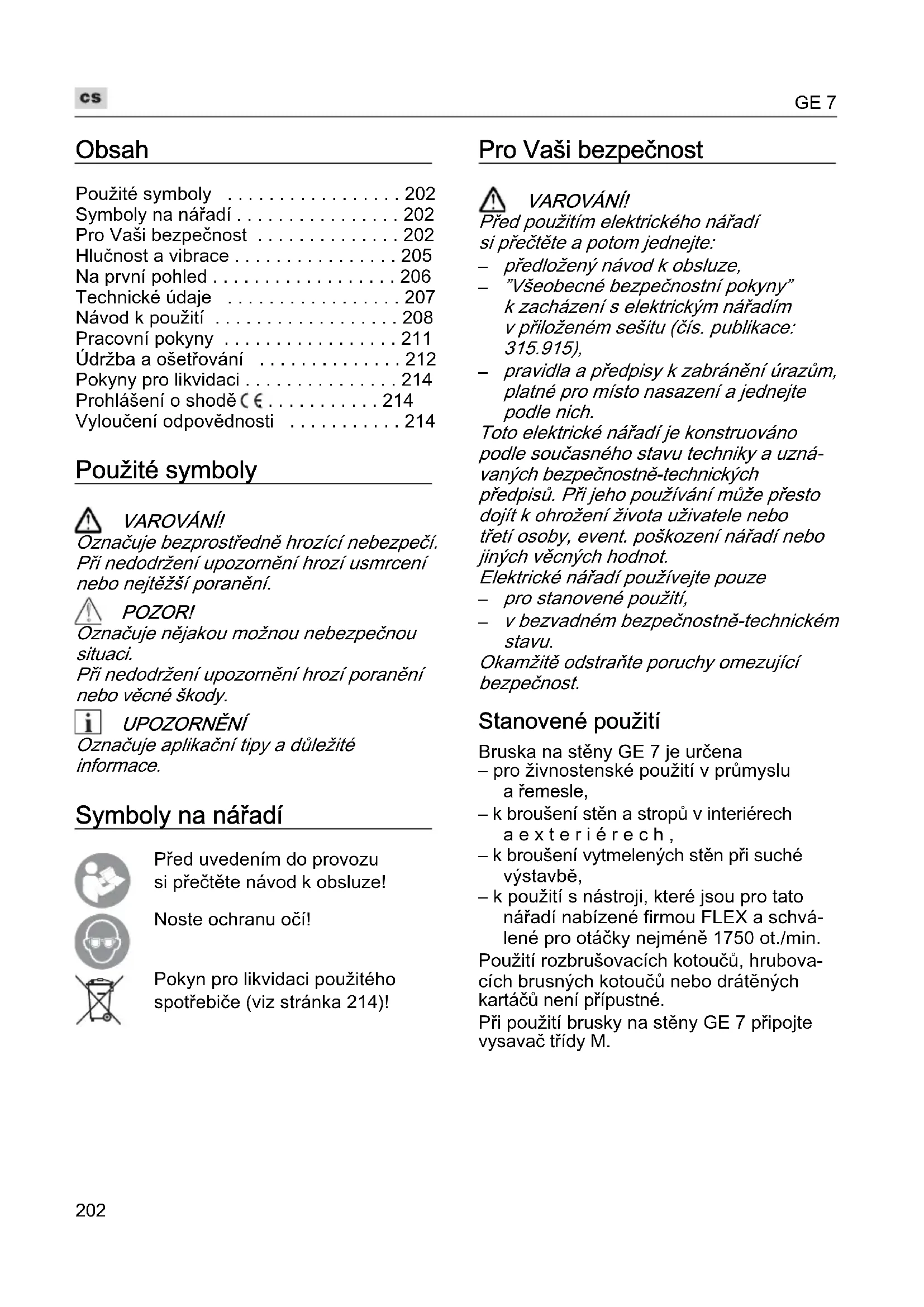 v bezvadném bezpečnostně-technickém stavu. Okamžitě odstraňte poruchy omezující bezpečnost. Stanovené použití Bruska na stěny GE 7 je určena – pro živnostenské použití v průmyslu a řemesle, – k broušení stěn a stropů v interiérech aexteriérech, – k broušení vytmelených stěn při suché výstavbě, – k použití s nástroji, které jsou pro tato nářadí nabízené firmou FLEX a schvá- lené pro otáčky nejméně 1750 ot./min. Použití rozbrušovacích kotoučů, hrubova- cích brusných kotoučů nebo drátěných kartáčů není přípustné. Při použití brusky na stěny GE 7 připojte vysavač třídy M.GE 7