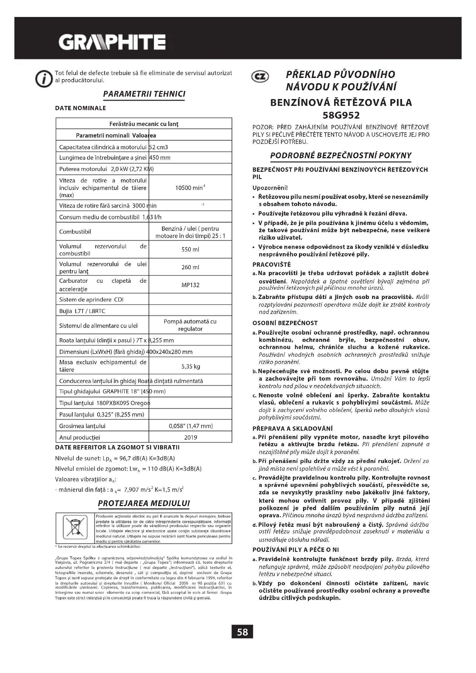 - Očistěte kontakty a seřiďte jejich vzdálenost (0,65 mm) (v případě potřeby zapalovací svíčku vyměňte). JINÉ POKYNY Zkontrolujte, zda nedošlo k úniku paliva, povolení upevňovacích prvků a poškození hlavních součástí, zejména spojů rukojetí a upevňovacích prvků vedení. Zjistíte-li jakékoliv poškození, pak je nutno pilu před opětovným použitím opravit. Veškeré závady je nutno nechat odstranit u autorizovaného servisu výrobce. TECHNICKÉ PARAMETRY JMENOVITÉ ÚDAJE Benzínová řetězová pila Jmenovitý parametr Hodnota Objem motoru 52 cm
