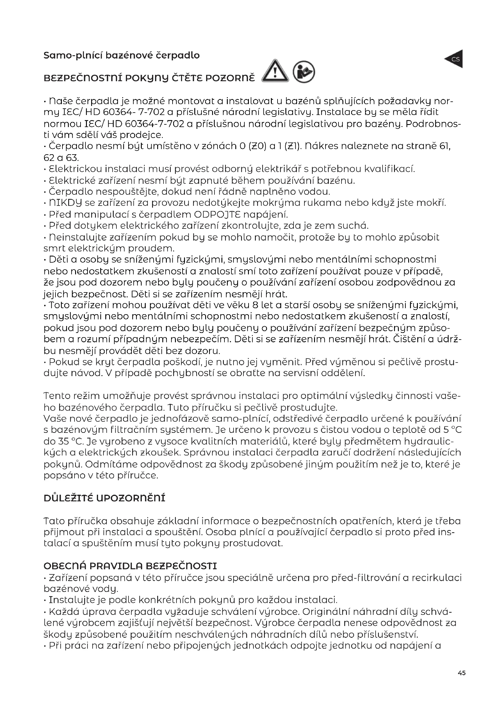 - Naše čerpadla je možné montovat a instalovat u bazénů splňujících požadavky nor- my IEC/ HD 60364- 7-702 a příslušné národní legislativy. Instalace by se měla řídit normou IEC/ HD 60364-7-702 a příslušnou národní legislativou pro bazény. Podrobnos- ti vám sdělí váš prodejce.