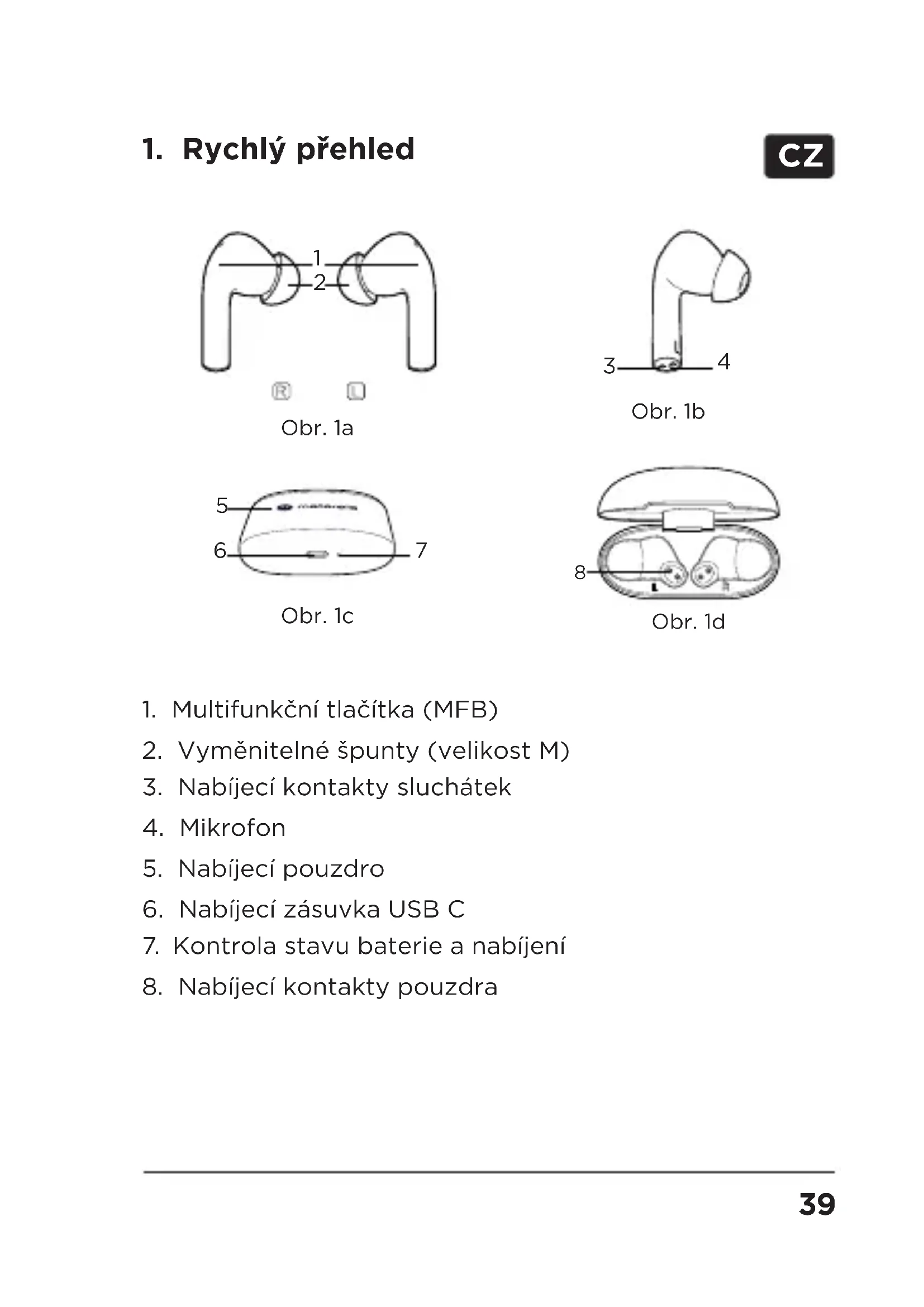 1. Zapnutí sluchátek: Otevřete víčko nabíjecího