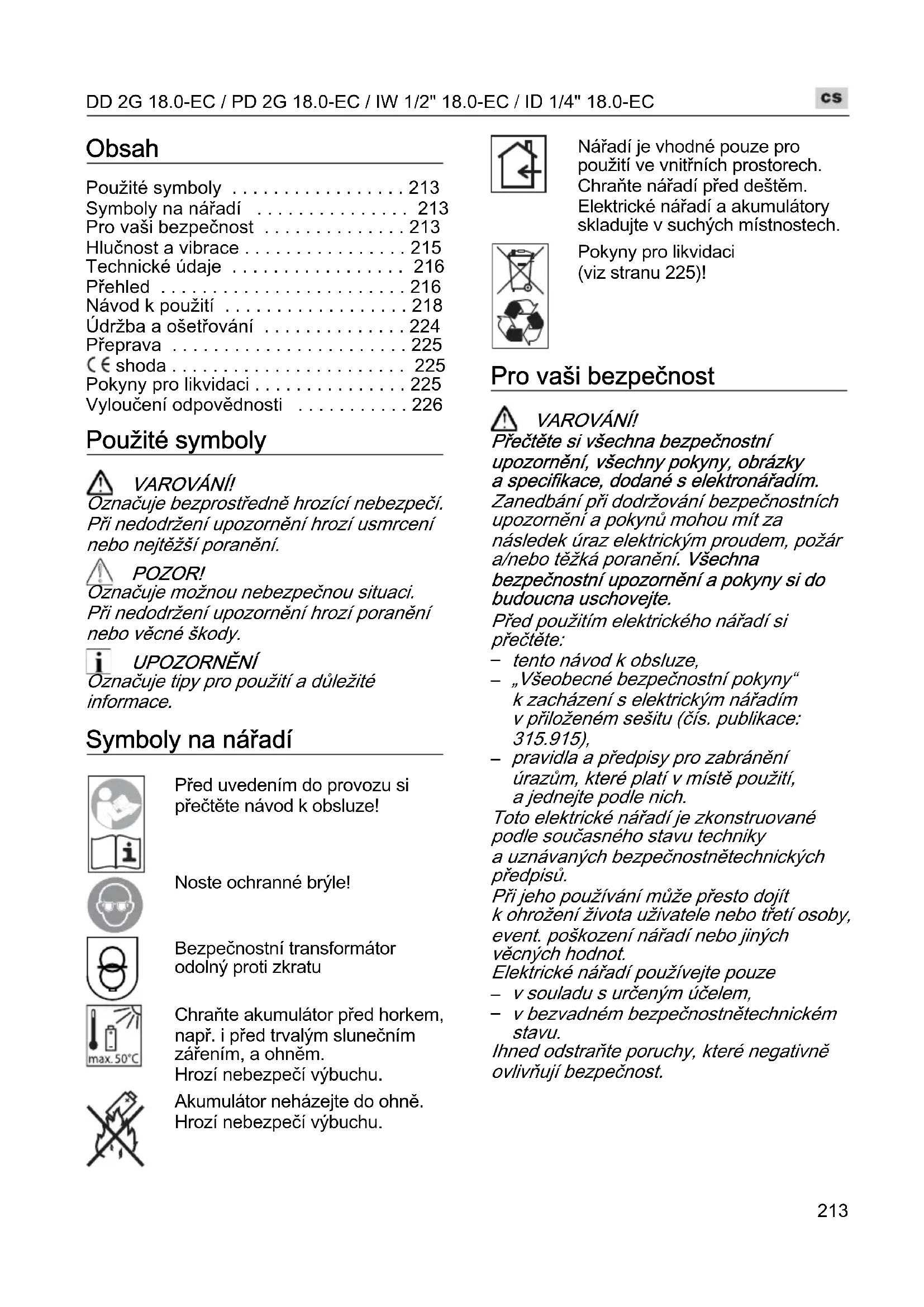 Pouze pro země EU. Podle evropské směrnice 2006/66/ES vadné nebo opotřebované akumulátory/ baterie rozebrané shromážděny a dodány k opětovnému zhodnocení nepoškozují- címu životní prostředí. UPOZORNĚNÍ O možnostech likvidace se informujte u specializovaného prodejce. Vyloučení odpovědnosti Výrobce a jeho zástupce neručí za škody a ušlý zisk vlivem přerušení obchodní činnosti, která byla způsobená výrobkem nebo eventuálně nemožností jeho použití. Výrobce a jeho zástupce neručí za škody, které byly způsobeny neodborným použitím nebo ve spojitosti s výrobky jiných výrobců.DD 2G 18.0-EC / PD 2G 18.0-EC / IW 1/2" 18.0-EC / ID 1/4" 18.0-EC