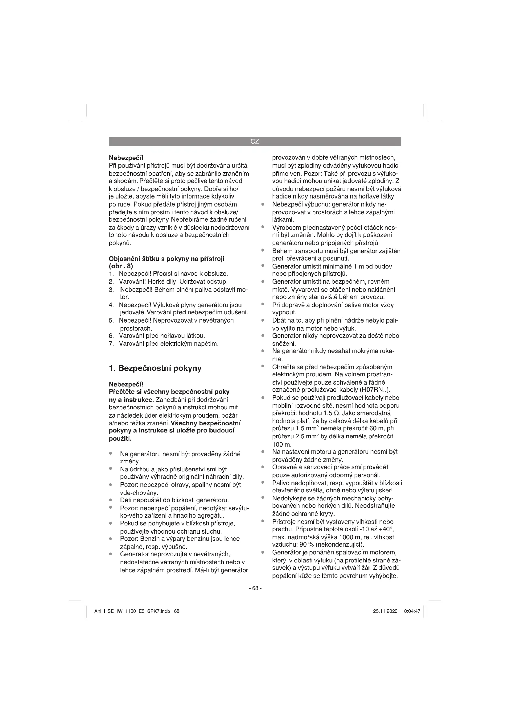 Generátor je poháněn spalovacím motorem, který v oblasti výfuku (na protilehlé straně zá- suvek) a výstupu výfuku vytváří žár. Z důvodů popálení kůže se těmto povrchům vyhýbejte. Anl_HSE_IW_1100_E5_SPK7.indb 68Anl_HSE_IW_1100_E5_SPK7.indb 68 25.11.2020 10:04:4725.11.2020 10:04:47CZ