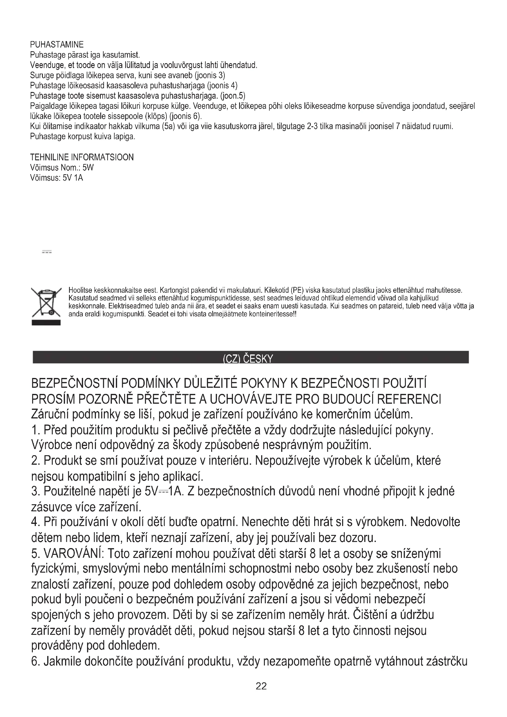 Napájení: 5V 1A Chcete-li zahájit nabíjení, zapojte napájecí kabel do nabíjecí zásuvky (6) a nabíječku do síťové zásuvky 220-240V~ 50/60Hz. Po zapojení napájecího adaptéru do zásuvky začne indikátor nabíjení (5d) zespodu nahoru blikat. Ochrana životního prostředí. Kartón odevzdejte do sběru. Polyetylénové sáčky (PE) vyhazujte do kontejneru na plasty. Vysloužilý přístroj odevzdejte do příslušného sběrného dvoru, protože některé části zařízení mohou představovat pro životní prostředí nebezpečí. Elektrický přístroj odevzdejte tak, aby se omezilo jeho opětovné používání. Pokud jsou v přístroji baterie, vyjměte je a odevzdejte do příslušného sběrného místa zvlášť. Přístroj nevyhazujte do popelnic ani kontejneru na směsný odpad!!25 CONDIȚII DE SIGURANȚĂ INSTRUCȚIUNI IMPORTANTE PRIVIND SIGURANȚA DE UTILIZARE CITIȚI CU ATENȚIE ȘI PĂSTRAȚI PENTRU REFERINȚA VIITORĂ Condițiile de garanție sunt diferite, dacă dispozitivul este utilizat în scopuri comerciale.