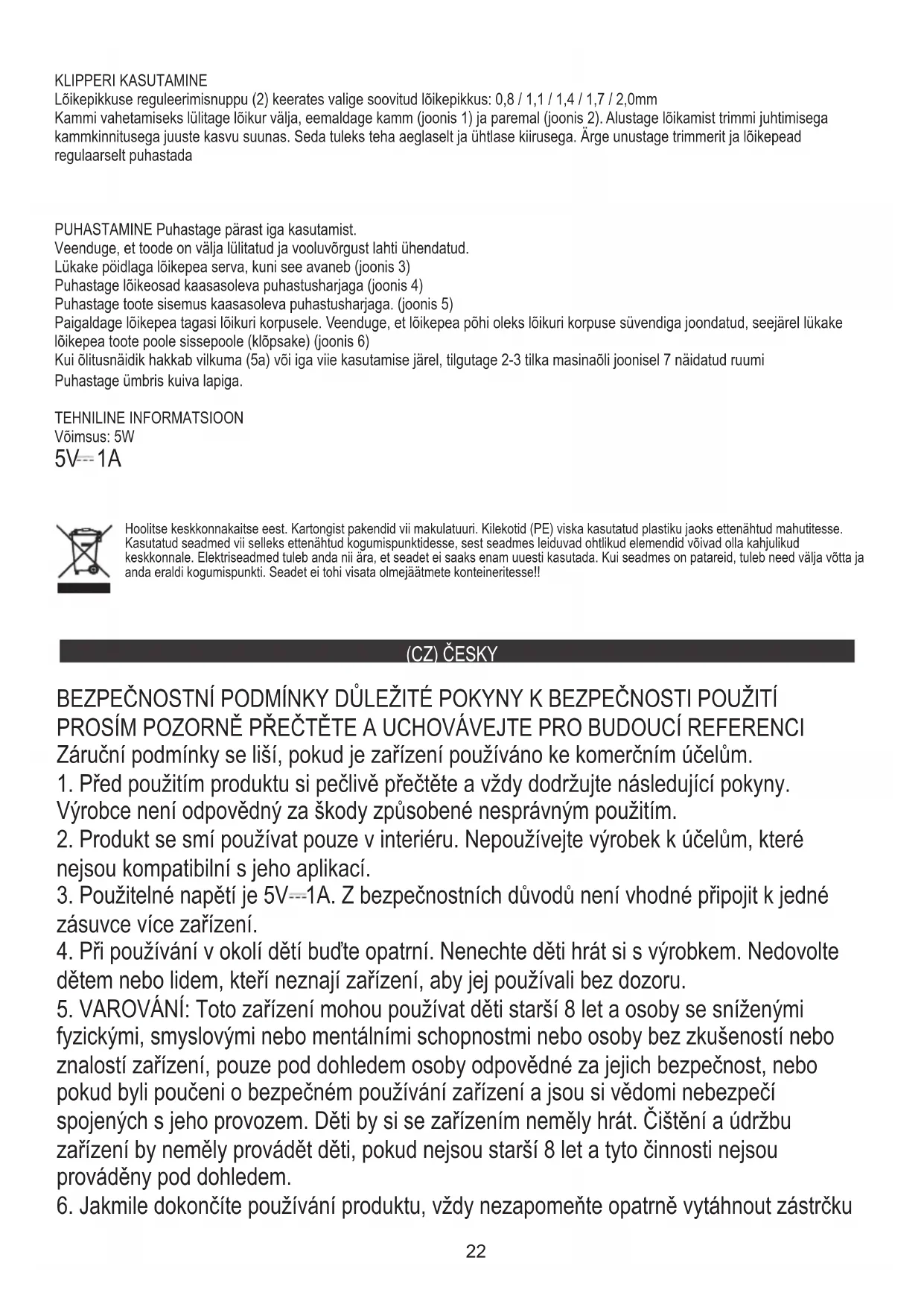 Stisknutím a podržením tlačítka napájení (4) po dobu 3 sekund zapnete nebo vypnete bezpečnostní zámek NABÍJENÍ BATERIE: POPIS VÝROBKU: INDIKACE OLEJE (5a) Stisknutím tlačítka napájení (4) jej zapnete nebo vypnete Vraťte řezací hlavu zpět na tělo strojku. Ujistěte se, že je spodní část řezací hlavy zarovnaná s vybráním těla strojku, a poté zatlačte řezací hlavu dovnitř k produktu (cvaknutí) (obr.6) Očistěte kryt suchým hadříkem. Jmenovitý výkon: 5W Vyčistěte vnitřek produktu dodaným čisticím kartáčem. (obr.5) Když indikátor mazání začne blikat (5a) nebo každých pět použití, nakapejte 2-3 kapky strojního oleje do prostoru zobrazeného na obr.7 Ujistěte se, že je produkt vypnutý a odpojený od elektrické sítě. ČIŠTĚNÍ Po každém použití vyčistěte. Vyčistěte řezné části pomocí dodaného čisticího kartáče (obr.4) Palcem zatlačte na okraj žací hlavy, dokud se neotevře (obr.3) Chcete-li zahájit nabíjení, zapojte napájecí kabel do nabíjecí zásuvky (6) a nabíječku do síťové zásuvky 220–240 V ~ 50/60 Hz. Když zapojíte napájecí adaptér do zásuvky, ozve se „pípnutí“ a indikátor nabíjení (5d) začne blikat zdola nahoru. Ochrana životního prostředí. Kartón odevzdejte do sběru. Polyetylénové sáčky (PE) vyhazujte do kontejneru na plasty. Vysloužilý přístroj odevzdejte do příslušného sběrného dvoru, protože některé části zařízení mohou představovat pro životní prostředí nebezpečí. Elektrický přístroj odevzdejte tak, aby se omezilo jeho opětovné používání. Pokud jsou v přístroji baterie, vyjměte je a odevzdejte do příslušného sběrného místa zvlášť. Přístroj nevyhazujte do popelnic ani kontejneru na směsný odpad!!25