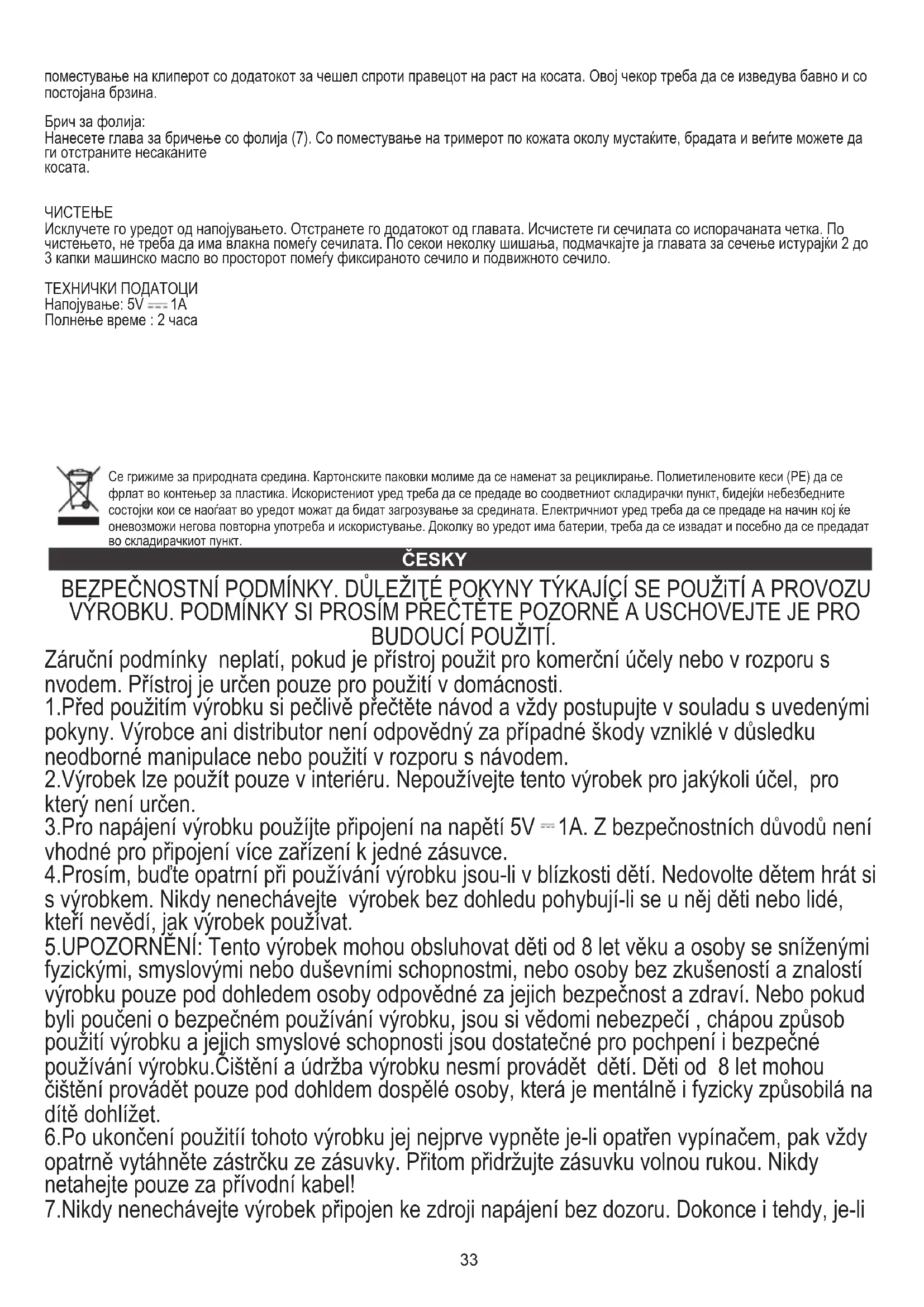 Odpojte zařízení od napájení. Odstraňte nástavec z hlavy. Očistěte čepele pomocí dodaného kartáčku. Po vyčištění by mezi čepelemi neměly být žádné vlasy. Po každých několika stříháních naolejujte stříhací hlavu a nalijte 2 až 3 kapky strojního oleje do prostoru mezi pevnou čepelí a pohyblivou čepelí. TECHNICKÁ DATA Napájení: 5V 1A Nabíjení čas : 2 hodiny Staráme se o životní prostředí. Papírové obaly odevzdávejte do sběrných surovin. Polyetylenová balení (PE) vhazujte do odpadkových košů na plasty. Použité zařízení odevzdávejte do sběrného dvoru, protože se v něm mohou nacházet části, které jsou pro životní prostředí škodlivé nebo nebezpečné. Elektrospotřebiče odevzdávejte v takové podobě, aby bylo znemožněno jejich další použití. Pokud se v zařízení nacházejí baterie, vyjměte je a odevzdejte zvlášť.36
