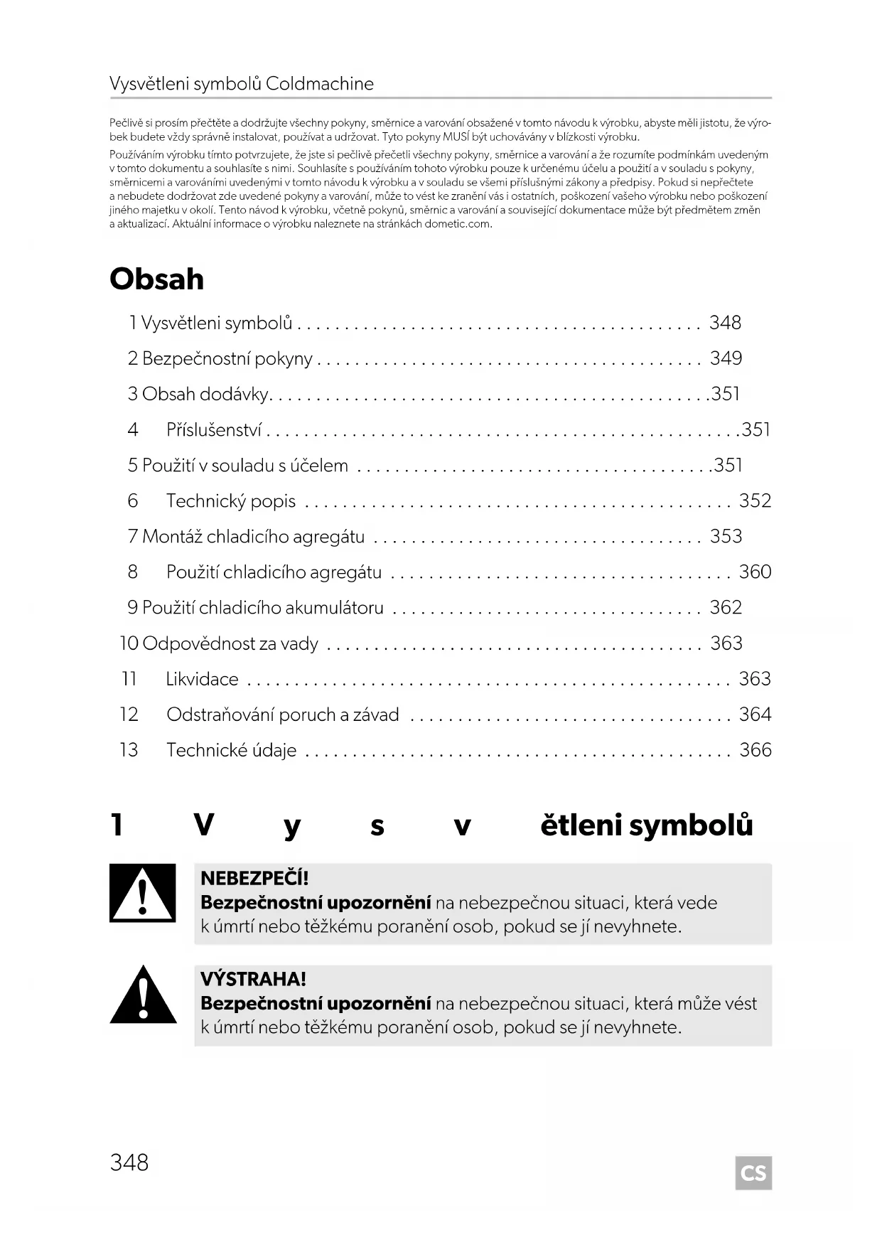 NEBEZPEČÍ! Bezpečnostní upozornění na nebezpečnou situaci, která vede k úmrtí nebo těžkému poranění osob, pokud se jí nevyhnete. VÝSTRAHA! Bezpečnostní upozornění na nebezpečnou situaci, která může vést k úmrtí nebo těžkému poranění osob, pokud se jí nevyhnete. DometicColdMachine50-54-55-84-85-86-94-95-96-CS-NC15_IOM_4445100001_EMEA16_20xx-xx-xx.book Page 348 Tuesday, May 4, 2021 7:24 PMCS Coldmachine Bezpečnostní pokyny