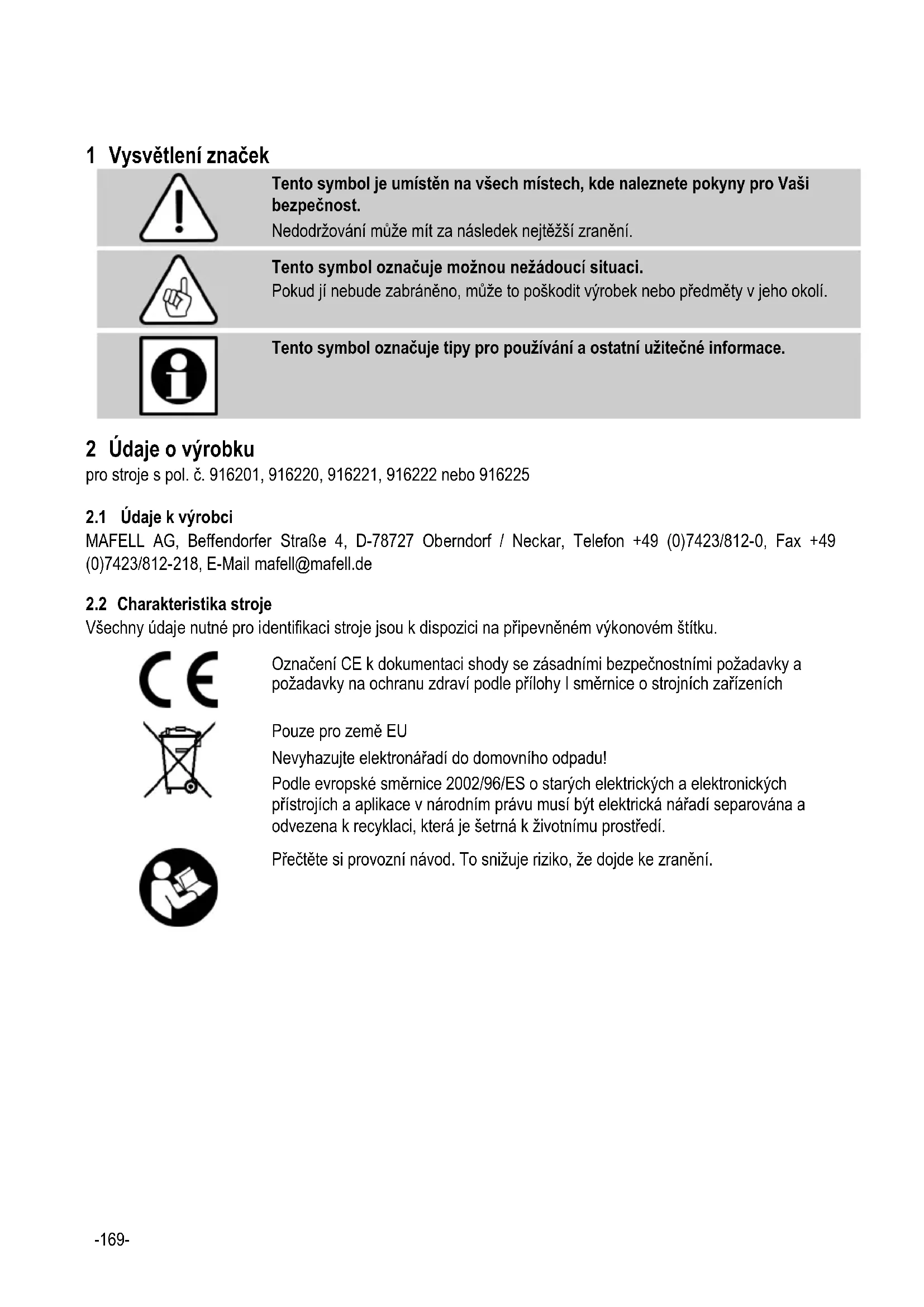 2 Údaje o výrobku pro stroje s pol. č. 916201, 916220, 916221, 916222 nebo 916225