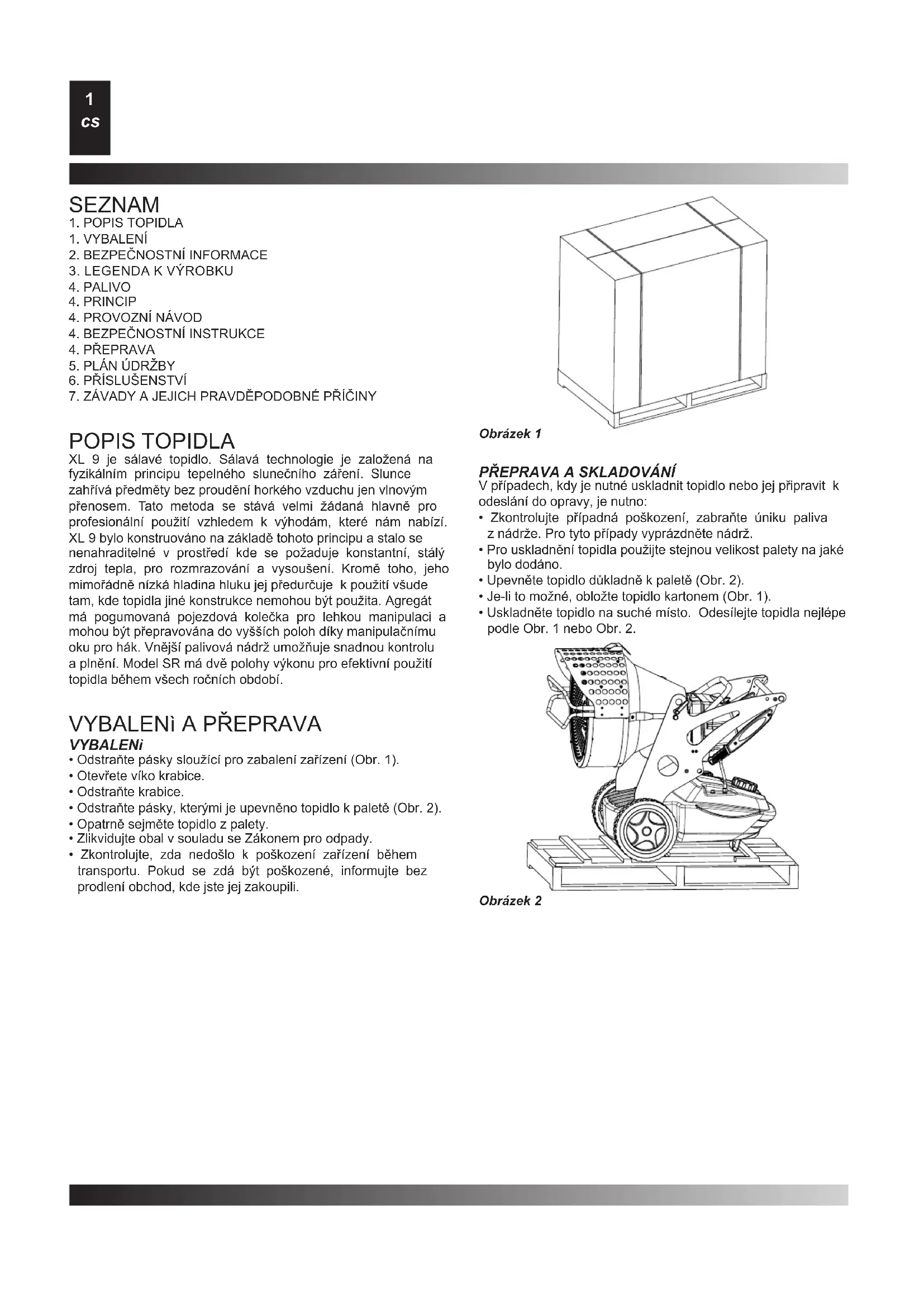 POPIS TOPIDLA XL 9 je sálavé topidlo. Sálavá technologie je založená na fyzikálním principu tepelného slunečního záření. Slunce zahřívá předměty bez proudění horkého vzduchu jen vlnovým přenosem. Tato metoda se stává velmi žádaná hlavně pro profesionální použití vzhledem k výhodám, které nám nabízí. XL 9 bylo konstruováno na základě tohoto principu a stalo se nenahraditelné v prostředí kde se požaduje konstantní, stálý zdroj tepla, pro rozmrazování a vysoušení. Kromě toho, jeho mimořádně nízká hladina hluku jej předurčuje k použití všude tam, kde topidla jiné konstrukce nemohou být použita. Agregát má pogumovaná pojezdová kolečka pro lehkou manipulaci a mohou být přepravována do vyšších poloh díky manipulačnímu oku pro hák. Vnější palivová nádrž umožňuje snadnou kontrolu a plnění. Model SR má dvě polohy výkonu pro efektivní použití topidla během všech ročních období. VYBALENì A PŘEPRAVA VYBALENì