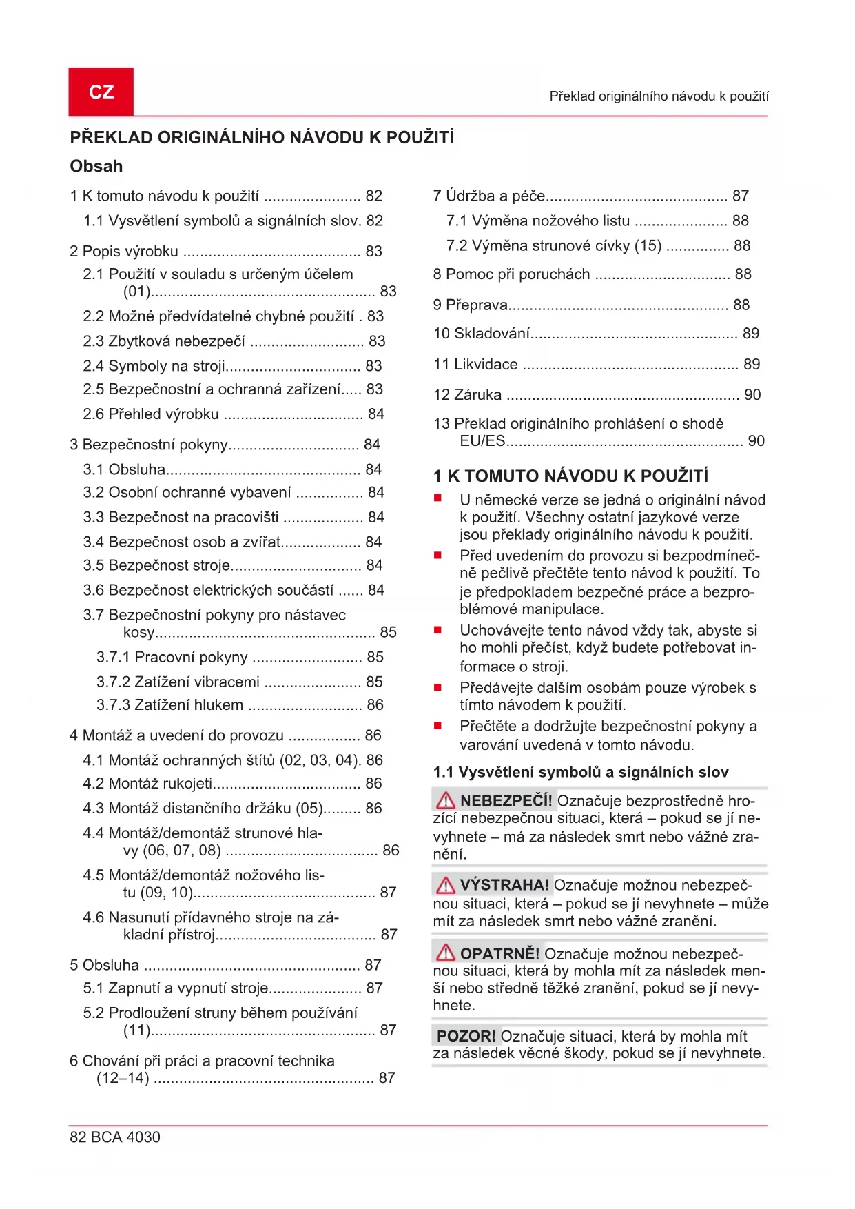 Ochranný štít Chrání uživatele před kontaktem s rotujícím listo- vým nožem, popř. strunou a odlétávajícími před- měty. Doplňkově je na ochranném štítu umístěn ochranný kroužek. Distanční držák Zajišťuje, že se nohy obsluhy nebudou nacházet v blízkosti rotujícího listového nože, popř. struny.CZ 84 BCA 4030 Bezpečnostní pokyny