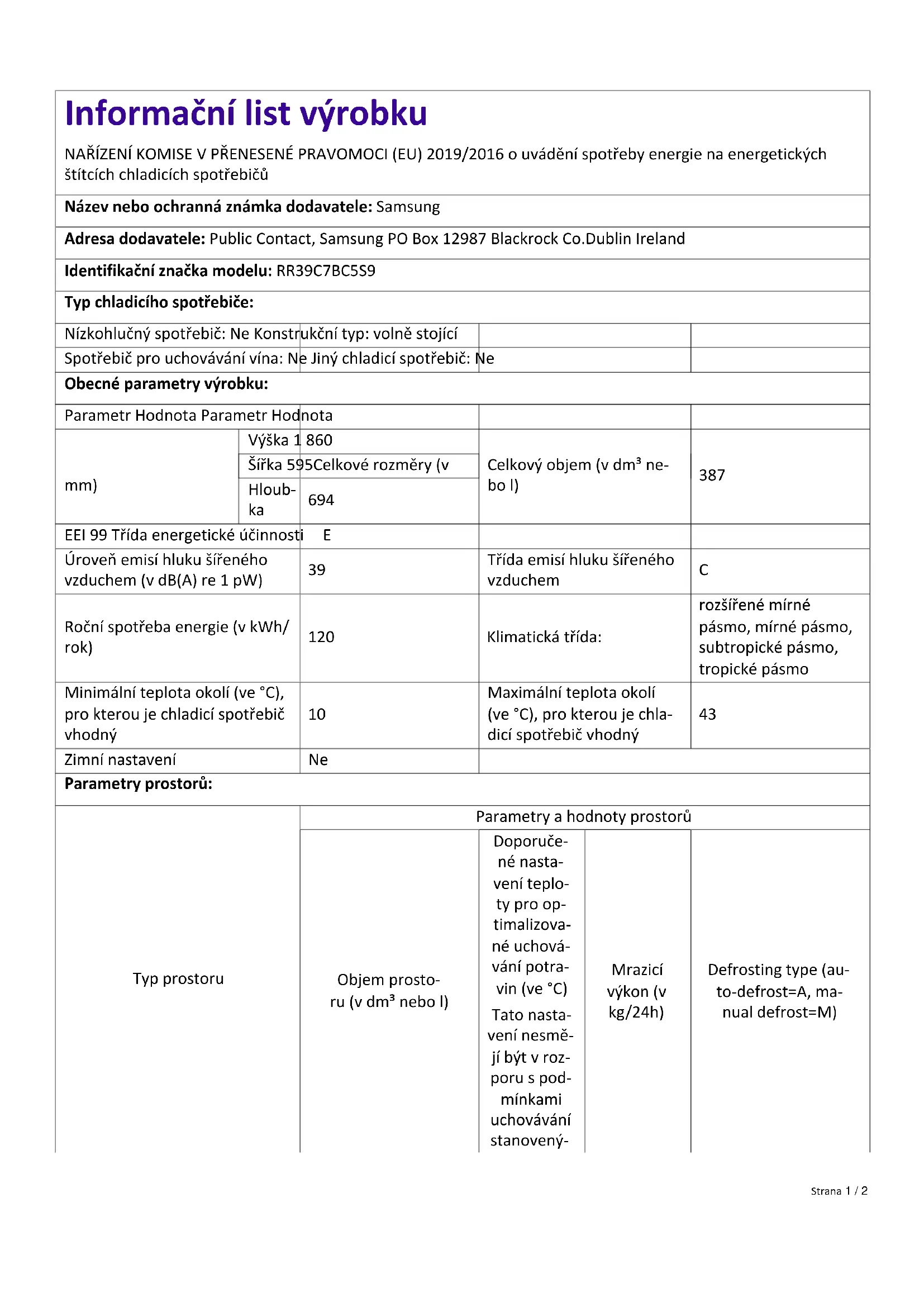 Light source parameters: Type of light source LED Energy efficiency class E Minimum duration of the guarantee offered by the manufacturer: 24 months Additional information: Weblink to the manufacturer's website, where the information in point4(a) Annex of Commission Regulation (EU) 2019/2019 is found: https://www.samsung.com/support Page 2 / 2Informační list výrobku NAŘÍZENÍ KOMISE V PŘENESENÉ PRAVOMOCI (EU) 2019/2016 o uvádění spotřeby energie na energetických štítcích chladicích spotřebičů Název nebo ochranná známka dodavatele: Samsung Adresa dodavatele: Public Contact, Samsung PO Box 12987 Blackrock Co.Dublin Ireland Identifikační značka modelu: RR39C7BC5S9 Typ chladicího spotřebiče: Nízkohlučný spotřebič: Ne Konstrukční typ: volně stojící Spotřebič pro uchovávání vína: Ne Jiný chladicí spotřebič: Ne Obecné parametry výrobku: Parametr Hodnota Parametr Hodnota Výška 1 860 Šířka 595Celkové rozměry (v mm) Hloub-