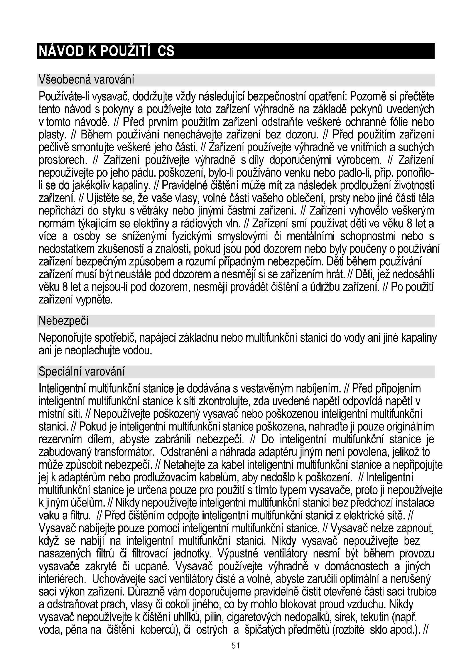 Všeobecná varování Používáte-li vysavač, dodržujte vždy následující bezpečnostní opatření: Pozorně si přečtěte tento návod s pokyny a používejte toto zařízení výhradně na základě pokynů uvedených v tomto návodě. // Před prvním použitím zařízení odstraňte veškeré ochranné fólie nebo plasty. // Během používání nenechávejte zařízení bez dozoru. // Před použitím zařízení pečlivě smontujte veškeré jeho části. // Zařízení používejte výhradně ve vnitřních a suchých prostorech. // Zařízení používejte výhradně s díly doporučenými výrobcem. // Zařízení nepoužívejte po jeho pádu, poškození, bylo-li používáno venku nebo padlo-li, příp. ponořilo- li se do jakékoliv kapaliny. // Pravidelné čištění může mít za následek prodloužení životnosti zařízení. // Ujistěte se, že vaše vlasy, volné části vašeho oblečení, prsty nebo jiné části těla nepřichází do styku s větráky nebo jinými částmi zařízení. // Zařízení vyhovělo veškerým normám týkajícím se elektřiny a rádiových vln. // Zařízení smí používat děti ve věku 8 let a více a osoby se sníženými fyzickými smyslovými či mentálními schopnostmi nebo s nedostatkem zkušeností a znalostí, pokud jsou pod dozorem nebo byly poučeny o používání zařízení bezpečným způsobem a rozumí případným nebezpečím. Děti během používání zařízení musí být neustále pod dozorem a nesmějí si se zařízením hrát. // Děti, jež nedosáhli věku 8 let a nejsou-li pod dozorem, nesmějí provádět čištění a údržbu zařízení. // Po použití zařízení vypněte. Nebezpečí Neponořujte spotřebič, napájecí základnu nebo multifunkční stanici do vody ani jiné kapaliny ani je neoplachujte vodou. Speciální varování Inteligentní multifunkční stanice je dodávána s vestavěným nabíjením. // Před připojením inteligentní multifunkční stanice k síti zkontrolujte, zda uvedené napětí odpovídá napětí v místní síti. // Nepoužívejte poškozený vysavač nebo poškozenou inteligentní multifunkční stanici. // Pokud je inteligentní multifunkční stanice poškozena, nahraďte ji pouze originálním rezervním dílem, abyste zabránili nebezpečí. // Do inteligentní multifunkční stanice je zabudovaný transformátor. Odstranění a náhrada adaptéru jiným není povolena, jelikož to může způsobit nebezpečí. // Netahejte za kabel inteligentní multifunkční stanice a nepřipojujte jej k adaptérům nebo prodlužovacím kabelům, aby nedošlo k poškození. // Inteligentní multifunkční stanice je určena pouze pro použití s tímto typem vysavače, proto ji nepoužívejte k jiným účelům. // Nikdy nepoužívejte inteligentní multifunkční stanici bez předchozí instalace vaku a filtru. // Před čištěním odpojte inteligentní multifunkční stanici z elektrické sítě. // Vysavač nabíjejte pouze pomocí inteligentní multifunkční stanice. // Vysavač nelze zapnout, když se nabíjí na inteligentní multifunkční stanici. Nikdy vysavač nepoužívejte bez nasazených filtrů či filtrovací jednotky. Výpustné ventilátory nesmí být během provozu vysavače zakryté či ucpané. Vysavač používejte výhradně v domácnostech a jiných interiérech. Uchovávejte sací ventilátory čisté a volné, abyste zaručili optimální a nerušený sací výkon zařízení. Důrazně vám doporučujeme pravidelně čistit otevřené části sací trubice a odstraňovat prach, vlasy či cokoli jiného, co by mohlo blokovat proud vzduchu. Nikdy vysavač nepoužívejte k čištění uhlíků, pilin, cigaretových nedopalků, sirek, tekutin (např. voda, pěna na čištění koberců), či ostrých a špičatých předmětů (rozbité sklo apod.). // 51Udržujte sací trubici či otevřené části zařízení stranou od vašeho obličeje a těla. Nikdy nepoužívejte svůj vysavač pro vysávání stavebního materiálu (jako je jemný písek, vápno, cementový prášek, tonerový prášek atd.). To by mohlo poškodit zařízení. Problémy a jejich řešení Problém Možný důvod Řešení Vysavač nepracuje. Vybitá baterie. Příruční vysavač není připevněný sestavený. Nabijte baterii. Sestavte příruční vysavač správně. Sací výkon poklesl. Zásobník na nečistoty je plný. Ucpaný filtr. Překážka v přívodu vzduchu nebo v otáčivé části elektrického kartáče. Vyprázdněte zásobník na nečistoty. Vyčistěte nebo vyměňte filtr. Vyčistěte elektrický kartáč. Vysavač se nenabíjí. Nabíječka není připojená do zásuvky. Konektor nabíječky není připojený do otvoru na těle vysavače. Příruční vysavač není připevněný k tělu vysavače. Připojte nabíječku do zásuvky. Připojte nabíječku k tělu vysavače. Připevněte příruční vysavač na tělo vysavače. Velmi krátká doba běhu po dobití. Nedostatečný čas dobíjení. Baterie stárne. Nabijte podle pokynů v návodu. Vyměňte baterii. Životní prostředí Spotřebič na konci jeho životnosti nevyhazujte do normálního domovního odpadu. Předejte ho ve stanoveném sběrném místě k recyklaci. Tímto způsobem pomůžete chránit životní prostředí. Tento spotřebič je označen v souladu s evropskou směrnicí 2012/19/EU o odpadních elektrických a elektronických zařízeních (WEEE/OEEZ). Tato směrnice je rámcem s celoevropskou platností pro sběr a recyklaci odpadů z elektrických a elektronických zařízení. Záruka a servis S případnými žádostmi o informace nebo s problémem se prosím obracejte na centrum péče o zákazníky společnosti Hisense ve vaší zemi (telefonní číslo na centrum péče o zákazníky najdete na celosvětovém záručním listě). Jestliže se ve vaší zemi žádné centrum péče o zákazníky nenachází, obraťte se na svého místního obchodního zá