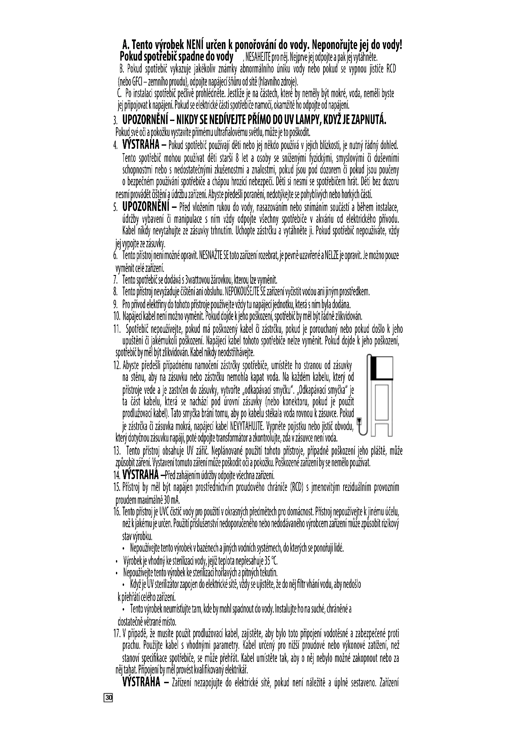 UPOZORNENI - Pred vlozenim rukou do vody, nasazovanim nebo smimanim soucasti a behem instalace, udzby vyhaveni ci manipulace s nim vzdy odpoje vsechny spotrebic v akvriu od elektrickho privodu. Kabel nikdy nevytahujte ze zasuvky trhutim. Uchopte zastrku a vtahnene ji. Pokud spotrebic nepouzivate, vzdy jej vypoje tze zasuvky.