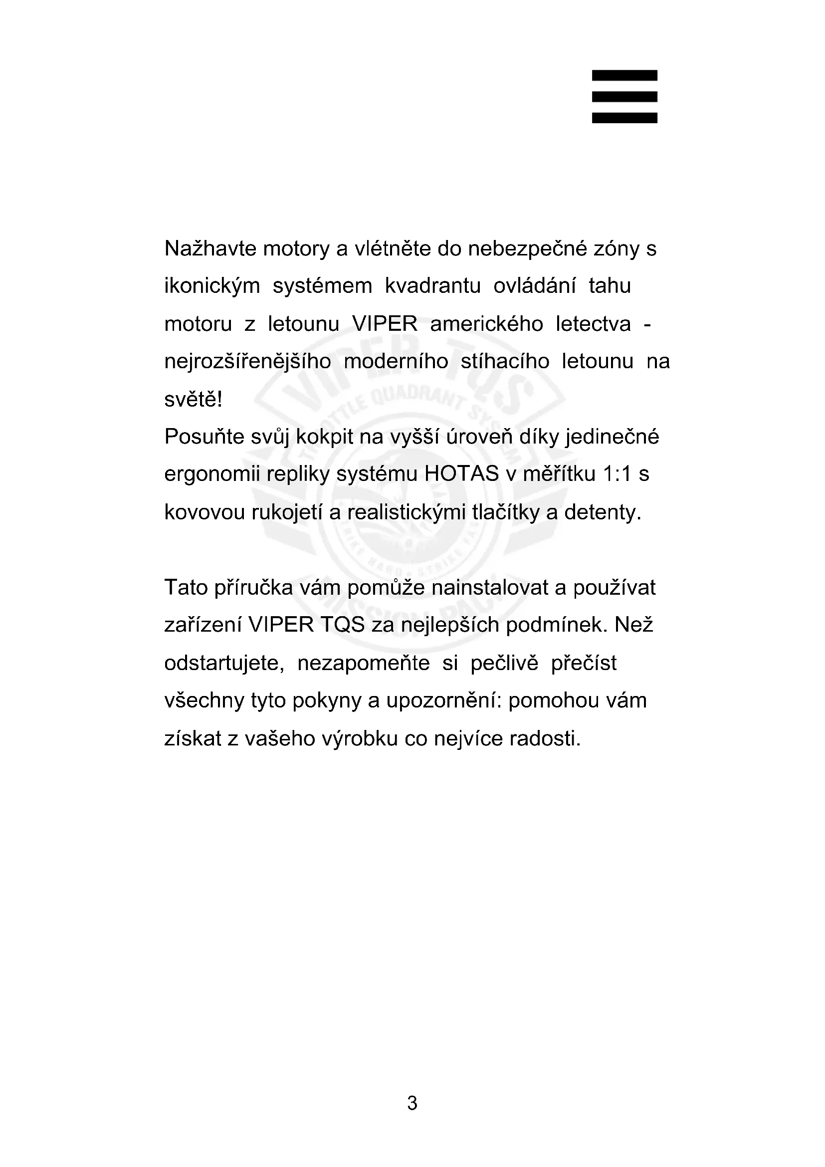 Nažhavte motory a vlétněte do nebezpečné zóny s ikonickým systémem kvadrantu ovládání tahu motoru z letounu VIPER amerického letectva - nejrozšířenějšího moderního stíhacího letounu na světě! Posuňte svůj kokpit na vyšší úroveň díky jedinečné ergonomii repliky systému HOTAS v měřítku 1:1 s kovovou rukojetí a realistickými tlačítky a detenty. Tato příručka vám pomůže nainstalovat a používat zařízení VIPER TQS za nejlepších podmínek. Než odstartujete, nezapomeňte si pečlivě přečíst všechny tyto pokyny a upozornění: pomohou vám získat z vašeho výrobku co nejvíce radosti.4