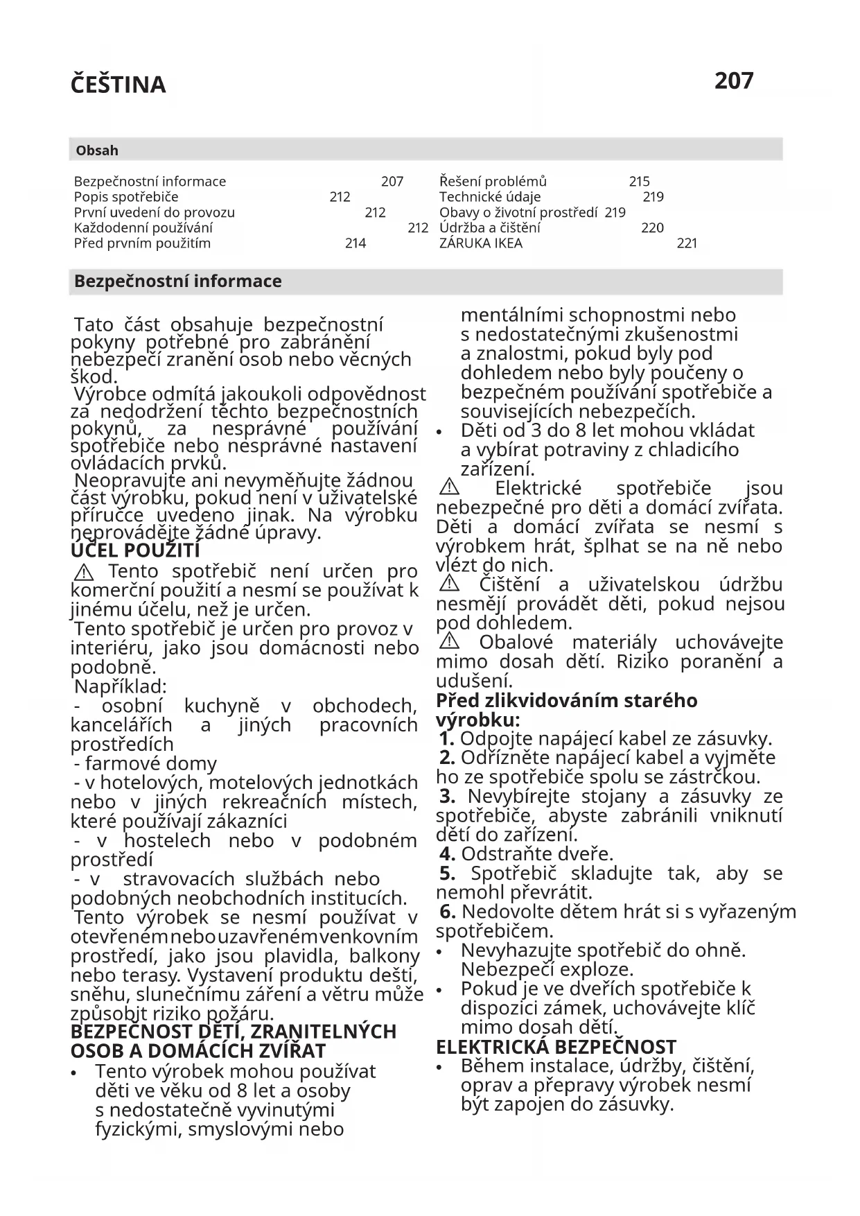 Bezpečnostní informace 207 Popis spotřebiče 212 První uvedení do provozu 212 Každodenní používání 212 Před prvním použitím 214 Obsah Řešení problémů 215 Technické údaje 219 Obavy o životní prostředí 219 Údržba a čištění 220
