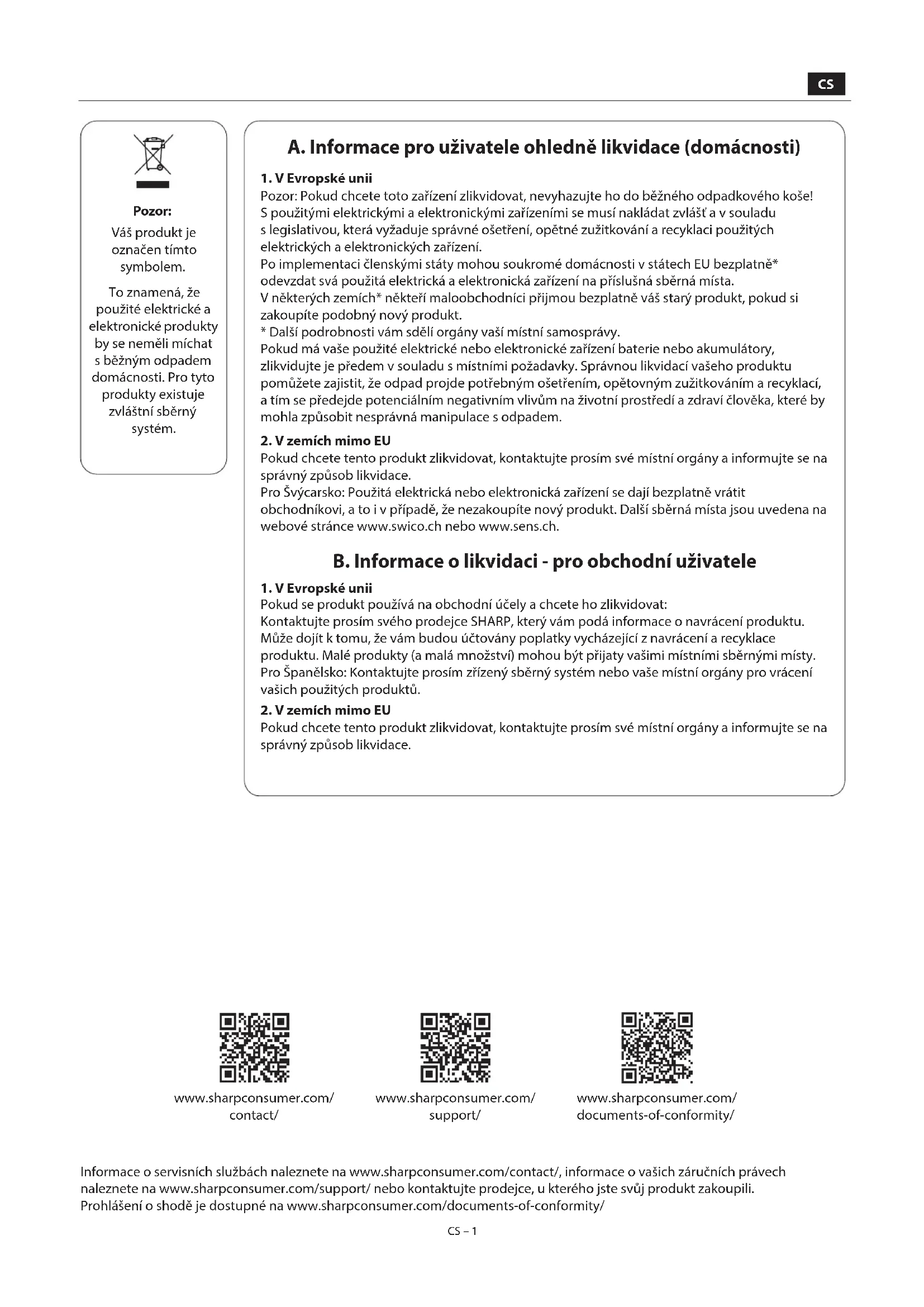 Pokud chcete tento produkt zlikvidovat, kontaktujte prosím své místní orgány a informujte se na správný způsob likvidace. Pozor: Váš produkt je označen tímto symbolem. To znamená, že použité elektrické a elektronické produkty by se neměli míchat s běžným odpadem domácnosti. Pro tyto produkty existuje zvláštní sběrný systém. www.sharpconsumer.com/ support/ www.sharpconsumer.com/ documents-of-conformity/ www.sharpconsumer.com/ contact/ Informace o servisních službách naleznete na www.sharpconsumer.com/contact/, informace o vašich záručních právech naleznete na www.sharpconsumer.com/support/ nebo kontaktujte prodejce, u kterého jste svůj produkt zakoupili. Prohlášení o shodě je dostupné na www.sharpconsumer.com/documents-of-conformity/ CSCS – 2 CS – 2