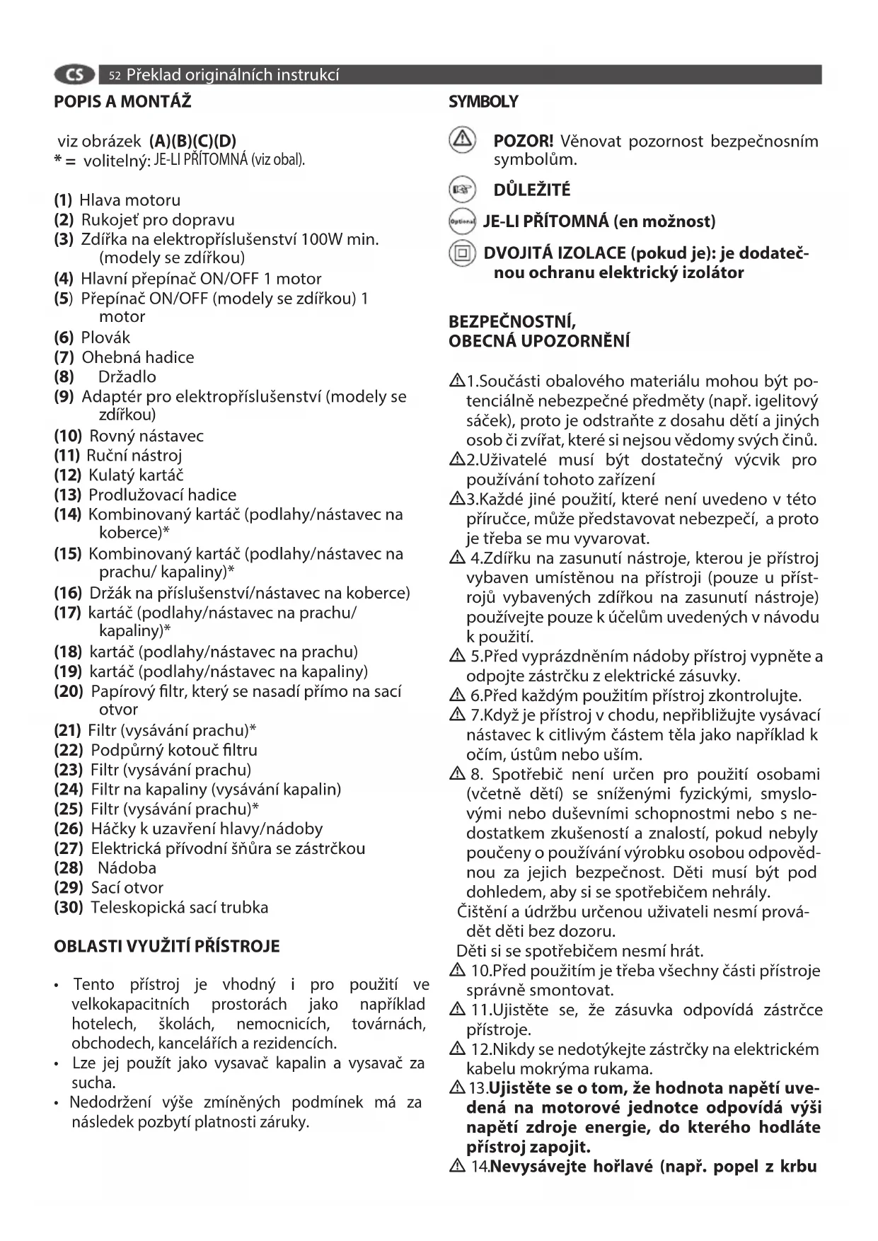 - = voltelný: JE-LI PŘÍTOMNÁ (viz obal). (1) Hlava motoru (2) Rukojeť pro dopravu (3) Zdířka na elektropříslušenství 100W min. (modely se zdířkou) (4) Hlavní přepínač ON/OFF 1 motor (5) Přepínač ON/OFF (modely se zdířkou) 1 motor (6) Plovák (7) Ohebná hadice (8) Držadlo (9) Adaptér pro elektropříslušenství (modely se zdířkou) (10) Rovný nástavec (11) Ruční nástroj (12) Kulatý kartáč (13) Prodlužovací hadice (14) Kombinovaný kartáč (podlahy/nástavec na koberce)* (15) Kombinovaný kartáč (podlahy/nástavec na prachu/ kapaliny)* (16) Držák na příslušenství/nástavec na koberce) (17) kartáč (podlahy/nástavec na prachu/ kapaliny)* (18) kartáč (podlahy/nástavec na prachu) (19) kartáč (podlahy/nástavec na kapaliny) (20) Papírový ltr, který se nasadí přímo na sací otvor (21) Filtr (vysávání prachu)* (22) Podpůrný kotouč ltru (23) Filtr (vysávání prachu) (24) Filtr na kapaliny (vysávání kapalin) (25) Filtr (vysávání prachu)* (26) Háčky k uzavření hlavy/nádoby (27) Elektrická přívodní šňůra se zástrčkou (28) Nádoba (29) Sací otvor (30) Teleskopická sací trubka
