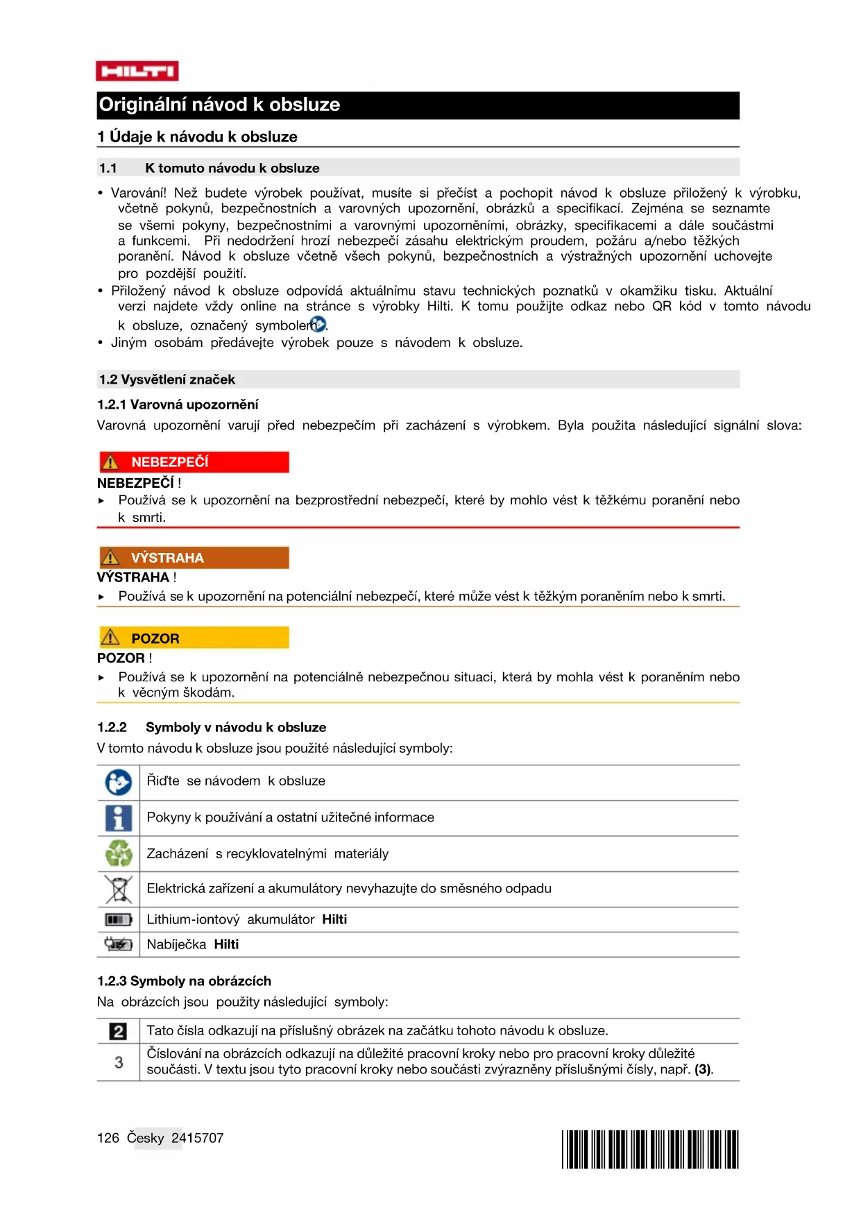 Výrobce prohlašuje na výhradní zodpovědnost, že zde popsaný výrobek odpovídá platným zákonům a splňuje platné normy. Kopii prohlášení o shodě najdete na konci této dokumentace. Technické dokumentace jsou uložené zde: Hilti Entwicklungsgesellschaft mbH | Zulassung Geräte | Hiltistraße 6 | 86916 Kaufering, DE 2 Bezpečnost