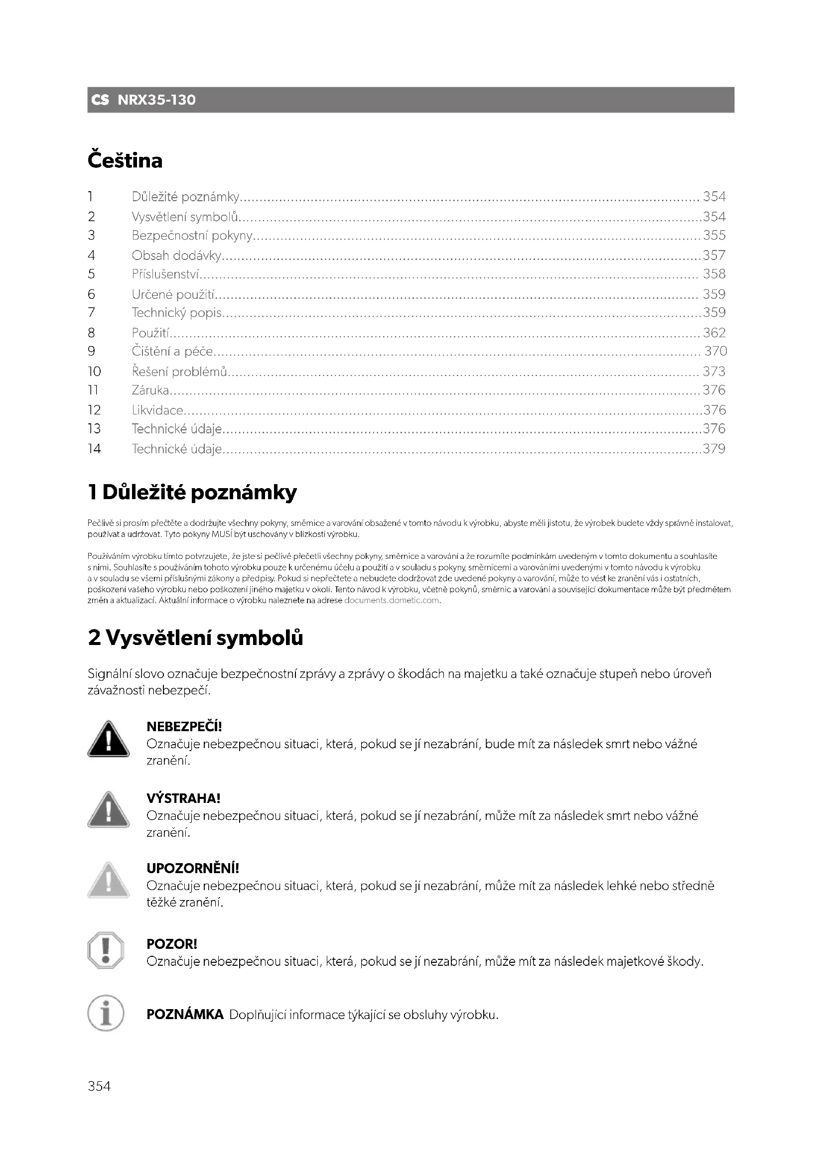 - dôvod reklamácie alebo opis chyby. Upozorňujeme vás, že samooprava alebo neodborná oprava môže mať zanásledok ohrozenie bezpečnosti azánik záruky. 12 Likvidácia POZOR! Nebezpečenstvo poškodenia Izolácia chladiaceho zariadenia obsahuje horľavý cyklopentán avyžaduje si špeciálne postupy prilikvidácii. Pouplynutí jeho životnosti odovzdanie chladiace zariadenie navhodnú recykláciu. 349CSNRX35-130 Čeština 1 Důležité poznámky..................................................................................................................... 354 2 Vysvětlení symbolů......................................................................................................................354 3 Bezpečnostní pokyny..................................................................................................................355 4 Obsah dodávky..........................................................................................................................357 5 Příslušenství............................................................................................................................... 358 6 Určené použití........................................................................................................................... 359 7 Technický popis..........................................................................................................................359 8 Použití....................................................................................................................................... 362 9 Čištění apéče............................................................................................................................ 370 10 Řešení problémů........................................................................................................................ 373 11 Záruka.......................................................................................................................................376 12 Likvidace....................................................................................................................................376 13 Technické údaje..........................................................................................................................376 14 Technické údaje..........................................................................................................................379 1 Důležité poznámky Pečlivě si prosím přečtěte adodržujte všechny pokyny, směrnice avarování obsažené vtomto návodu kvýrobku, abyste měli jistotu, že výrobek budete vždy správně instalovat, používat audržovat. Tyto pokyny MUSÍ být uschovány vblízkosti výrobku. Používáním výrobku tímto potvrzujete, že jste si pečlivě přečetli všechny pokyny, směrnice avarování aže rozumíte podmínkám uvedeným vtomto dokumentu asouhlasíte snimi. Souhlasíte spoužíváním tohoto výrobku pouze kurčenému účelu apoužití avsouladu spokyny, směrnicemi avarováními uvedenými vtomto návodu kvýrobku avsouladu se všemi příslušnými zákony apředpisy. Pokud si nepřečtete anebudete dodržovat zde uvedené pokyny avarování, může to vést ke zranění vás iostatních, poškození vašeho výrobku nebo poškození jiného majetku vokolí. Tento návod kvýrobku, včetně pokynů, směrnic avarování asouvisející dokumentace může být předmětem změn aaktualizací. Aktuální informace ovýrobku naleznete na adresedocuments.dometic.com. 2 Vysvětlení symbolů Signální slovo označuje bezpečnostní zprávy azprávy oškodách na majetku ataké označuje stupeň nebo úroveň závažnosti nebezpečí. NEBEZPEČÍ! Označuje nebezpečnou situaci, která, pokud se jí nezabrání, bude mít zanásledek smrt nebo vážné zranění. VÝSTRAHA! Označuje nebezpečnou situaci, která, pokud se jí nezabrání, může mít zanásledek smrt nebo vážné zranění. UPOZORNĚNÍ! Označuje nebezpečnou situaci, která, pokud se jí nezabrání, může mít zanásledek lehké nebo středně těžké zranění. POZOR! Označuje nebezpečnou situaci, která, pokud se jí nezabrání, může mít zanásledek majetkové škody. POZNÁMKA Doplňující informace týkající se obsluhy výrobku.