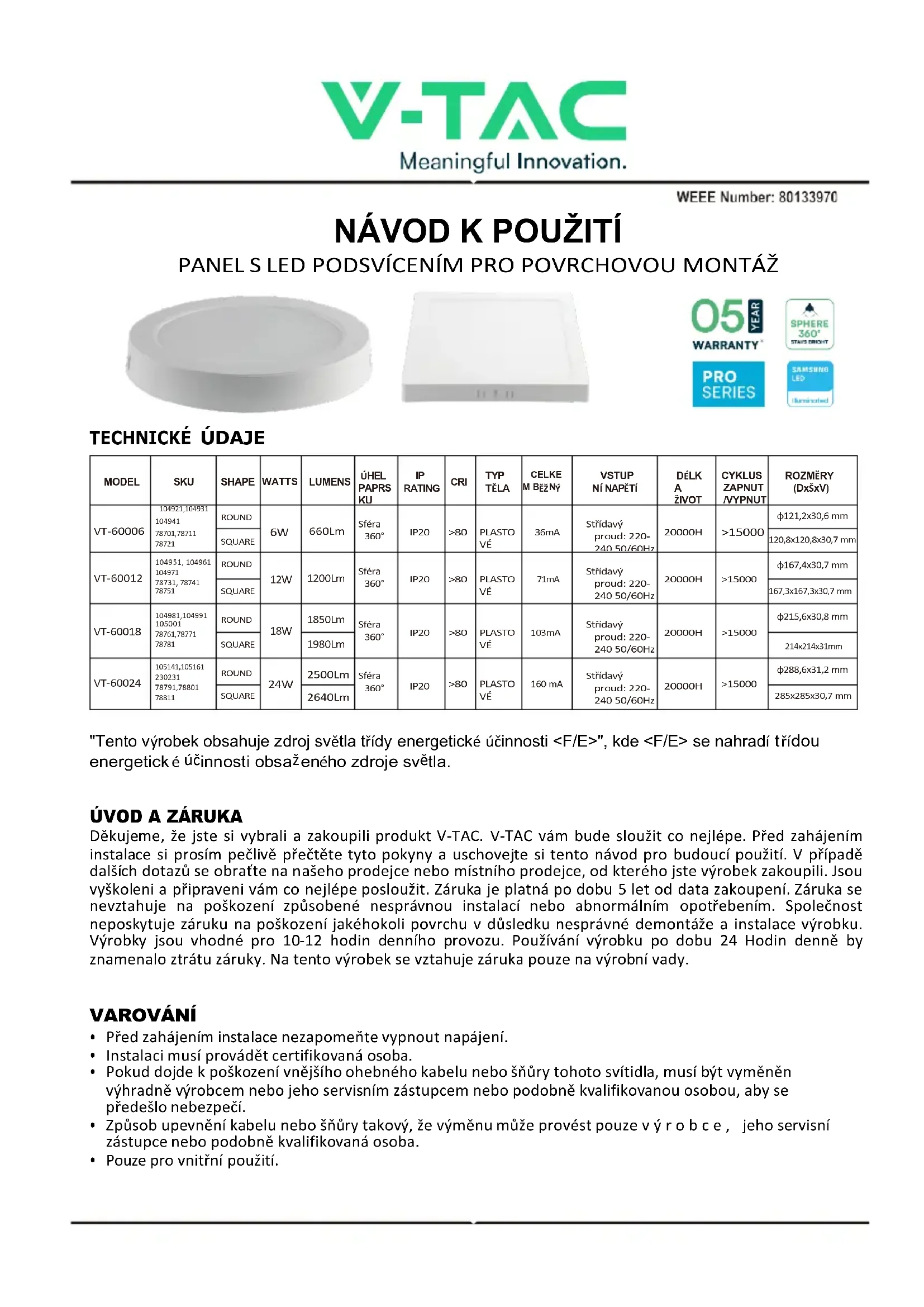 Děkujeme, že jste si vybrali a zakoupili produkt V-TAC. V-TAC vám bude sloužit co nejlépe. Před zahájením instalace si prosím pečlivě přečtěte tyto pokyny a uschovejte si tento návod pro budoucí použití. V případě dalších dotazů se obraťte na našeho prodejce nebo místního prodejce, od kterého jste výrobek zakoupili. Jsou vyškoleni a připraveni vám co nejlépe posloužit. Záruka je platná po dobu 5 let od data zakoupení. Záruka se nevztahuje na poškození způsobené nesprávnou instalací nebo abnormálním opotřebením. Společnost neposkytuje záruku na poškození jakéhokoli povrchu v důsledku nesprávné demontáže a instalace výrobku. Výrobky jsou vhodné pro 10-12 hodin denního provozu. Používání výrobku po dobu 24 Hodin denně by znamenalo ztrátu záruky. Na tento výrobek se vztahuje záruka pouze na výrobní vady.