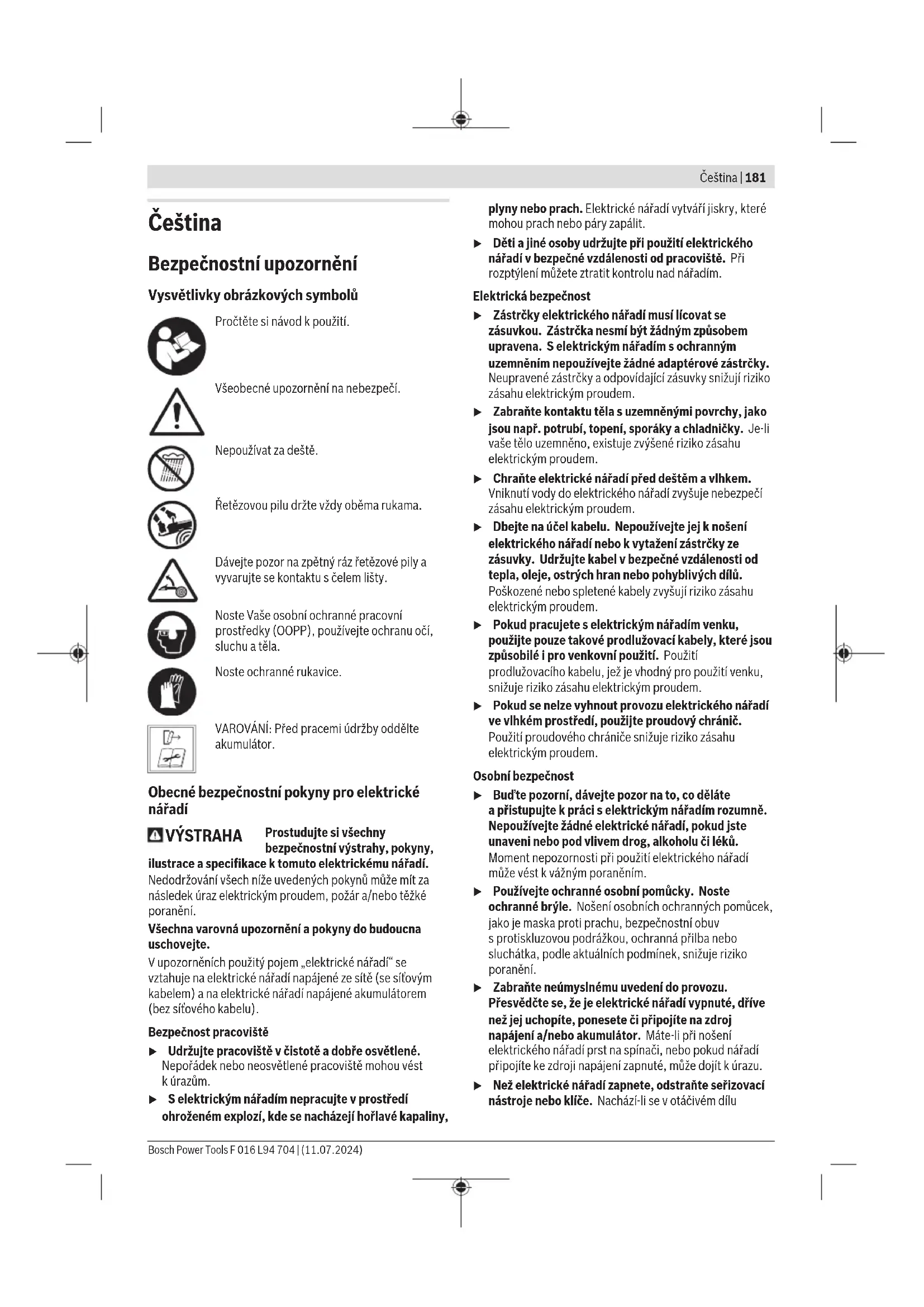 1,5 Uvedená(é) celková(é) hodnota(y) vibrací a uvedená(é) hodnota(y) emise hluku byly naměřeny podle normované zkušební metody a mohou se použít pro srovnání elektronářadí s jiným. Uvedená(é) celková(é) hodnota(y) vibrací a uvedená(é) hodnota(y) emise hluku se mohou použít i pro předběžný odhad zátěže. Emise vibrací a hluku se mohou během reálného používání elektronářadí odchylovat od uváděných hodnot v závislosti na způsobu, jakým se elektronářadí používá, zejména, jaký druh obrobku se opracovává; a kvůli nezbytnosti pevně stanovit bezpečnostní opatření pro ochranu obsluhy, jež se zakládají na odhadu zatížení vibracemi během skutečných podmínek používání (přitom je třeba zohlednit všechny části pracovního cyklu, např. časy, v kterých je elektronářadí vypnuté a takové, v kterých je sice zapnuté, ale běží bez zatížení). Akumulátor Bosch prodává akumulátorové elektrické nářadí ibez akumulátoru. Na obale je uvedené, zda je součástí dodávky elektrického nářadí akumulátor. Nabíjení akumulátoru u Používejte pouze nabíječky uvedené vtechnických údajích. Jen tyto nabíječky jsou přizpůsobené pro lithium-iontový akumulátor používaný svaším elektronářadím. Upozornění: Lithium-iontové akumulátory se na základě mezinárodních dopravních předpisů dodávají částečně nabité. Aby byl zaručen plný výkon akumulátoru, před prvním použitím akumulátor úplně nabijte. Nasazení akumulátoru Vložte nabitý akumulátor do uchycení akumulátoru tak, aby citelně zaskočil. Vyjmutí akumulátoru Pro vyjmutí akumulátoru stiskněte odjišťovací tlačítko avytáhněte akumulátor. Nepoužívejte přitom násilí. Akumulátorje opatřený 2stupni zajištění, které mají zabránit vypadnutí akumulátoru při neúmyslném stisknutí odjišťovacího tlačítka. Pokud je akumulátor nasazený do elektrického nářadí, drží ho vpříslušné poloze pružina. Ukazatel stavu nabití akumulátoru Zelené LED ukazatele stavu nabití akumulátoru indikují stav nabití akumulátoru. Zbezpečnostních důvodů je zjištění stavu nabití možné pouze při vypnutém elektronářadí. Pro zobrazení stavu nabití stiskněte tlačítko ukazatele stavu nabití nebo . Je to možné také při vyjmutém akumulátoru. Pokud po stisknutí tlačítka ukazatele stavu nabití nesvítí žádná LED, je akumulátor vadný amusí se vyměnit. Typ akumulátoru GBA 18V... LED Kapacita Trvale svítí 3 zelené 60–100% Trvale svítí 2 zelené 30–60% Trvale svítí 1 zelená 5–30% Bliká 1 zelená 0–5% Typ akumulátoru ProCORE18V... LED Kapacita Trvale svítí 5 zelených 80–100% Trvale svítí 4 zelené 60–80% Trvale svítí 3 zelené 40–60% Trvale svítí 2 zelené 20–40% Trvale svítí 1 zelená 5–20% Bliká 1 zelená 0–5% Upozornění pro optimální zacházení s akumulátorem Akumulátor chraňte před vlhkostí a vodou. Akumulátor skladujte pouze v teplotním rozmezí od −20 °C do 50 °C. Nenechávejte akumulátor ležet např. v létě v autě. Příležitostně vyčistěte větrací otvory akumulátoru měkkým, čistým a suchým štětcem. Výrazně kratší doba chodu po nabití ukazuje, že je akumulátor opotřebovaný a musí se vyměnit. Dodržujte pokyny pro likvidaci. Péče o akumulátor Pro zaručení optimálního používání akumulátoru dbejte následujících upozornění a opatření: F 016 L94 704 | (11.07.2024) Bosch Power ToolsČeština | 187 – Chraňte akumulátor před vlhkostí a vodou. – Elektronářadí a akumulátor skladujte pouze v teplotním rozsahu od –20°C do 50°C. Nenechávejte akumulátor např. v létě ležet v autě. – Akumulátor skladujte odděleně a nikoli v zahradním nářadí. – Při přímém slunečním záření nenechávejte akumulátor v zahradním nářadí. – Optimální teplota pro uskladnění akumulátoru činí 5 °C. – Příležitostně vyčistěte větrací otvory akumulátoru měkkým, čistým a suchým štětcem. Výrazně zkrácená doba provozu po nabití ukazuje, že je akumulátor opotřebovaný a musí se nahradit. Montáž Pro Vaši bezpečnost u Pozor! Před pracemi údržby a čištění elektronářadí vypněte a odstraňte akumulátor. u Pozor! Řetěz je ostrý. Při práci s řetězem vždy noste ochranné rukavice. u Řetězovou pilu v žádném případě neprovozujte v blízkosti osob, dětí nebo zvířat, rovněž ne po požití alkoholu, drog nebo omamných léků. u Řetězovou pilu používejte pouze, pokud je kryt správně zajištěný upevňovacími čepy (8). Montáž lišty a napnutí pilového řetězu (viz obrázkyB1 – B4) u Pozor! Pilový řetěz nenapínejte, když je horký. – Řetězovou pilu položte na vhodnou plochu krytem (14) nahoru. – Odstraňte kryt (14) tím, že odejmete obě upevňovací matice (15) pomocí dodaného montážního nástroje (13). – Podržte lištu (11) nosem kolmo nahoru a upevněte nový nebo naostřený pilový řetěz (12) ve správném směru na lištu (viz obrázek B1). – Vodicí čep (10) nastavte doleva tím, že budete otáčet šroubem pro napínání řetězu (7) proti směru hodinových ručiček. Upozornění: Lišta na řetězové pile nelícuje, pokud není vodicí čep (10) správně vyrovnaný. – Přesvědčete se, že pilový řetěz (12) leží správně v drážce okolo celé lišty. – Položte pilový řetěz kolem řetězového kola (3) a nasuňte lištu (11) na upevňovací čep (8). – Nasaďte kryt (14) přes upevňovací čepy (8). – Dejte upevňovací matice (15) na upevňovací čepy (8) a upevňovací matice (15) opatrně rukou utáhněte, aby se kryt (14) zajistil. (viz obrázek B3). – Použijte montážní nástroj (13) pro otáčení šroubem napínání řetězu (7) ve směru hodinových ručiček, až je řetěz okolo lišty napnutý. Spr