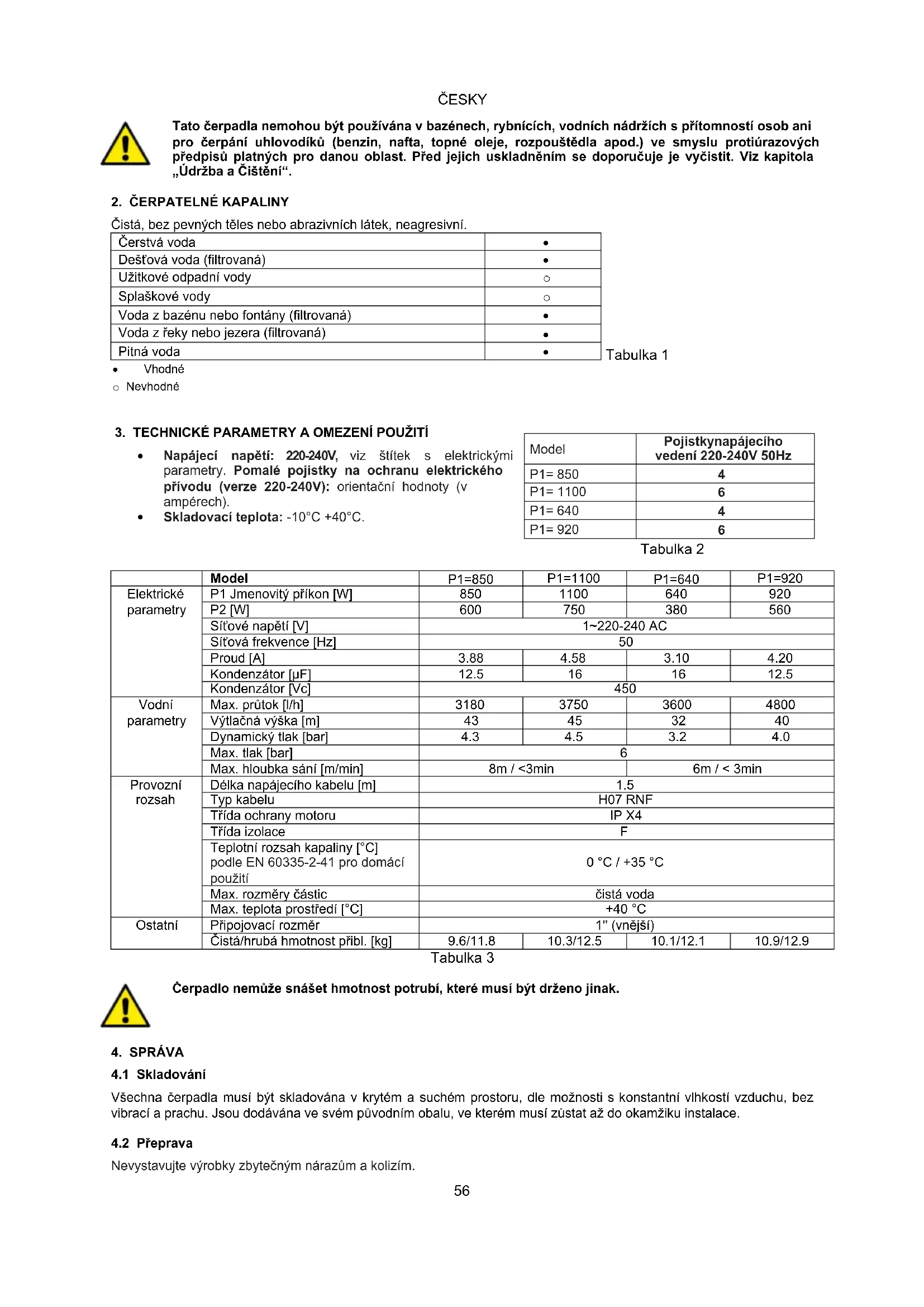 Tato čerpadla nemohou být používána v bazénech, rybnících, vodních nádržích s přítomností osob ani pro čerpání uhlovodíků (benzin, nafta, topné oleje, rozpouštědla apod.) ve smyslu protiúrazových předpisů platných pro danou oblast. Před jejich uskladněním se doporučuje je vyčistit. Viz kapitola „Údržba a Čištění“.