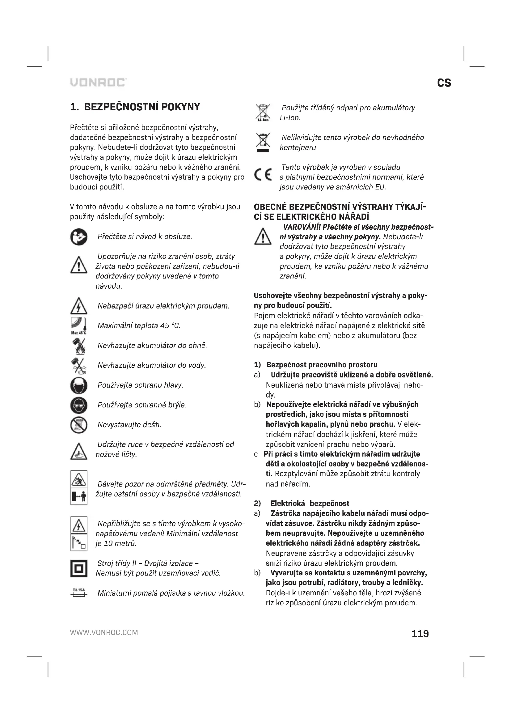Poškozená alikvidovaná elektrická nebo elektronická zařízení musí být odevzdána ve sběrných dvorech, které jsou určeny pro tento účel. Pouze pro země EU Nevyhazujte elektrická nářadí do běžného domácího odpadu. Podle evropské směrnice 2012/19/EC týka- jící se likvidace elektrických aelektronických zařízení ajejí implementace do vnitrostátního práva, musí být nepoužívaná elektrická nářadí shromažďována odděleně ajejich likvidace musí být provedena tak, aby nedošlo kohrožení životního prostředí. ZÁRUKA Výrobky VONROC jsou vyvíjeny vsouladu spoža- davky norem na nejvyšší kvalitu aje zaručeno, že po dobu platné záruky, která začíná běžet dnem původního nákupu, nebudou na těchto výrobcích žádné vady materiálu, ani vady způsobené špatným dílenským zpracováním. Dojde-li během tohoto období kzávadě vdůsledku vady materiálu nebo dílenského zpracování, kontaktujte přímo fi rmu VONROC. Ztéto záruky jsou vyloučeny následující případy: