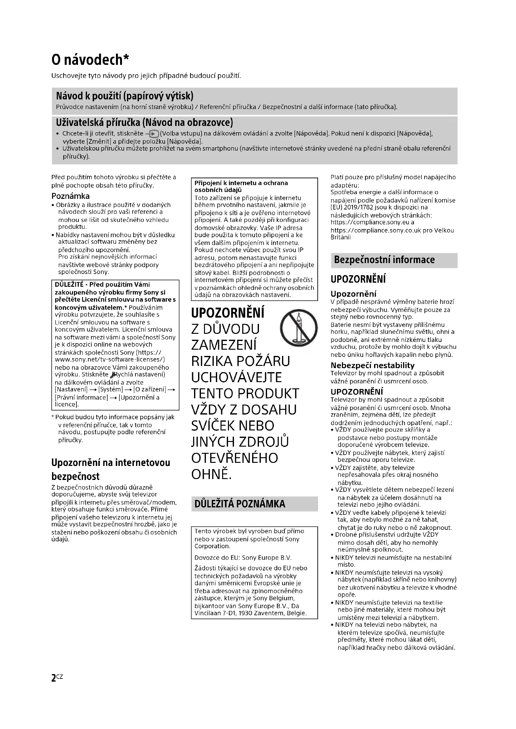 OHNĚ. Platí pouze pro příslušný model napájecího adaptéru:Spotřeba energie a další informace o napájení podle požadavků nařízení komise (EU) 2019/1782 jsou k dispozici na následujících webových stránkách:https://compliance.sony.eu ahttps://compliance.sony.co.uk pro Velkou Británii UPOZORNĚNÍ Upozornění V případě nesprávné výměny baterie hrozí nebezpečí výbuchu. Vyměňujte pouze za stejný nebo rovnocenný typ.Baterie nesmí být vystaveny přílišnému horku, například slunečnímu světlu, ohni a podobně, ani extrémně nízkému tlaku vzduchu, protože by mohlo dojít k výbuchu nebo úniku hořlavých kapalin nebo plynů. Nebezpečí nestability Televizor by mohl spadnout a způsobit vážné poranění či usmrcení osob. UPOZORNĚNÍ Televizor by mohl spadnout a způsobit vážné poranění či usmrcení osob. Mnoha zraněním, zejména dětí, lze předejít dodržením jednoduchých opatření, např.:• VŽDY používejte pouze skříňky a podstavce nebo postupy montáže doporučené výrobcem televize.• VŽDY používejte nábytek, který zajistí bezpečnou oporu televize.• VŽDY zajistěte, aby televize nepřesahovala přes okraj nosného nábytku.• VŽDY vysvětlete dětem nebezpečí lezení na nábytek za účelem dosáhnutí na televizi nebo jejího ovládání.• VŽDY veďte kabely připojené k televizi tak, aby nebylo možné za ně tahat, chytat je do ruky nebo o ně zakopnout.• Drobné příslušenství udržujte VŽDY mimo dosah dětí, aby ho nemohly neúmyslně spolknout.• NIKDY televizi neumísťujte na nestabilní místo.• NIKDY neumísťujte televizi na vysoký nábytek (například skříně nebo knihovny) bez ukotvení nábytku a televize k vhodné opoře.• NIKDY neumísťujte televizi na textilie nebo jiné materiály, které mohou být umístěny mezi televizí a nábytkem.• NIKDY na televizi nebo nábytek, na kterém televize spočívá, neumísťujte předměty, které mohou lákat děti, například hračky nebo dálková ovládání. O návodech* Uschovejte tyto návody pro jejich případné budoucí použití. Návod k použití (papírový výtisk) Průvodce nastavením (na horní straně výrobku) / Referenční příručka / Bezpečnostní a další informace (tato příručka). Uživatelská příručka (Návod na obrazovce)