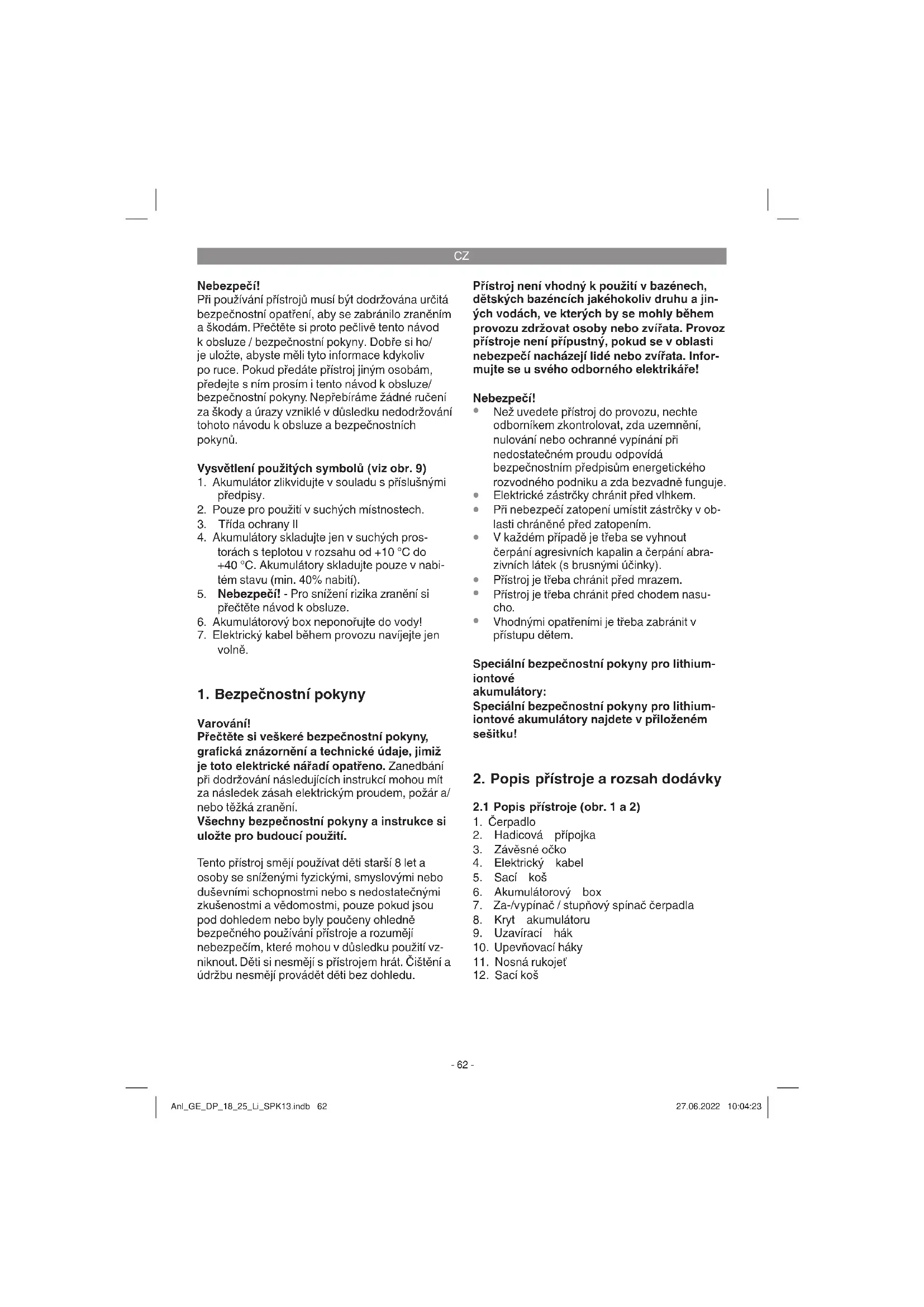 Napětí .....................................................18 V d.c. Dopravované množství max. ...................7500 l/h Dopravní výška max. ..................................... 5 m Dopravní tlak max. ..................0,05 MPa (0,5 bar) Hloubka ponoření max. ................................. 4 m Teplota vody max. ...................................... 35°C Hadicová přípojka ............................. cca 42 mm (1 1/4") vnějš. závit Cizí tělesa max. .....................................Ø 25 mm Odsávací výška ...........................min. cca 35 mm Minimální hladina vody při uvedení do provozu ... .................................................................. 40 mm Druh ochrany čerpadla .................................IPX8 Druh ochrany akumulátorového boxu ...........IPX4 Anl_GE_DP_18_25_Li_SPK13.indb 63Anl_GE_DP_18_25_Li_SPK13.indb 63 27.06.2022 10:04:2427.06.2022 10:04:24CZ