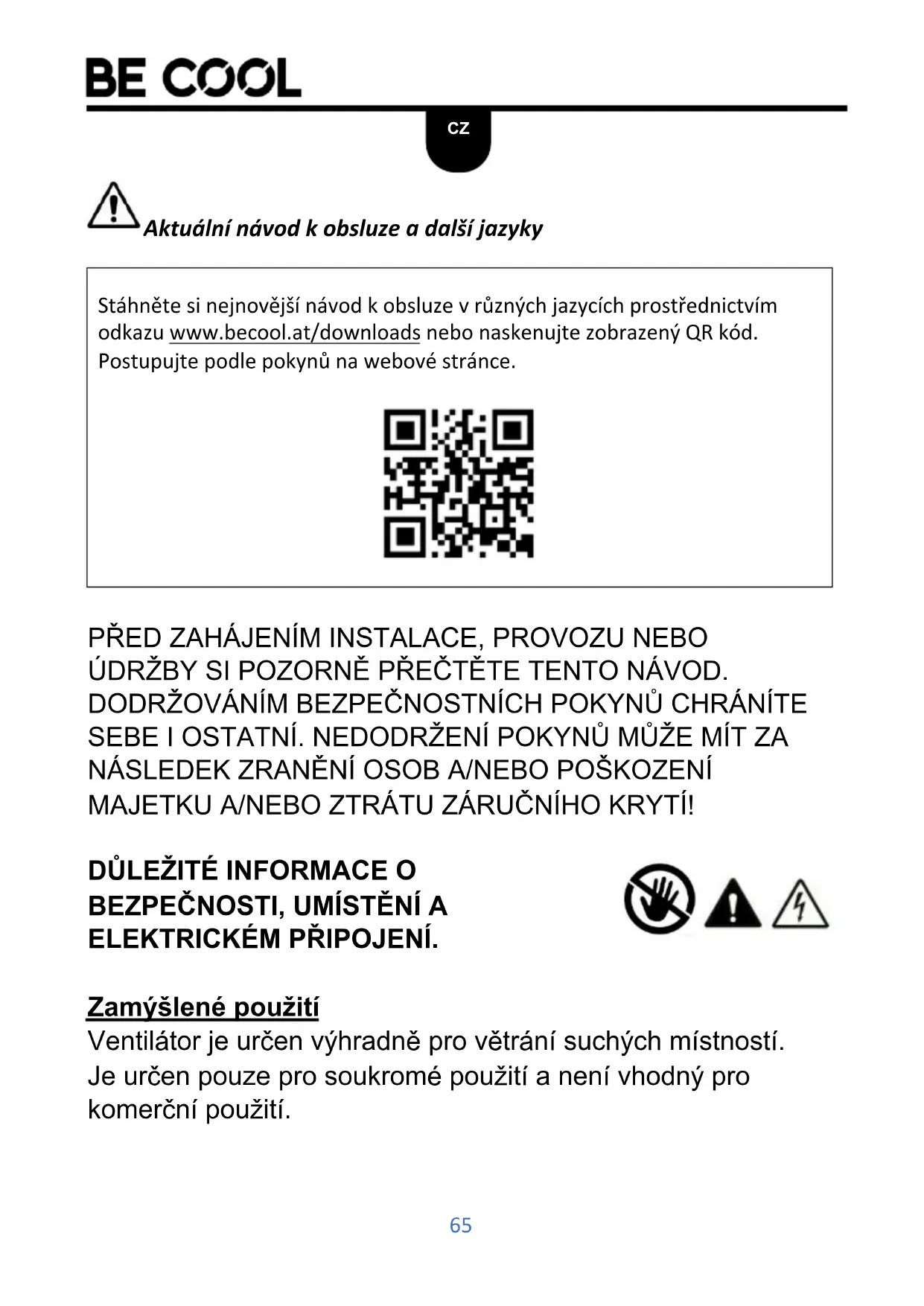 Stáhněte sinejnovějsí námod k obsluze v rúznych jazycích prostřednictvím odkazu www.becool.at/downloads nebo naskenujte zobrażné QR kód. Postupujte podlePokynu na webové stránce.
