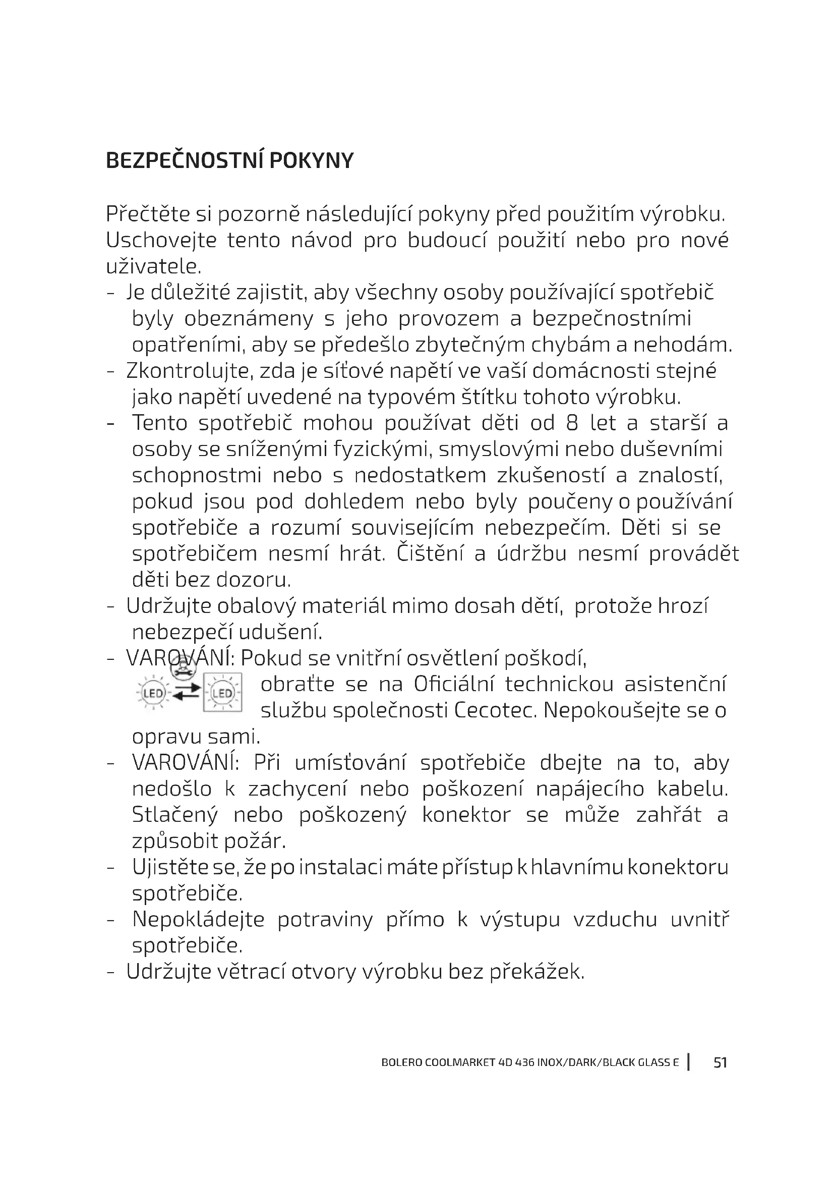 Přečtěte si pozorně následující pokyny před použitím výrobku. Uschovejte tento návod pro budoucí použití nebo pro nové uživatele. - Je důležité zajistit, aby všechny osoby používající spotřebič byly obeznámeny s jeho provozem a bezpečnostními opatřeními, aby se předešlo zbytečným chybám a nehodám. - Zkontrolujte, zda je síťové napětí ve vaší domácnosti stejné jako napětí uvedené na typovém štítku tohoto výrobku. - Tento spotřebič mohou používat děti od 8 let a starší a osoby se sníženými fyzickými, smyslovými nebo duševními schopnostmi nebo s nedostatkem zkušeností a znalostí, pokud jsou pod dohledem nebo byly poučeny o používání spotřebiče a rozumí souvisejícím nebezpečím. Děti si se spotřebičem nesmí hrát. Čištění a údržbu nesmí provádět děti bez dozoru. - Udržujte obalový materiál mimo dosah dětí, protože hrozí nebezpečí udušení. - VAROVÁNÍ: Pokud se vnitřní osvětlení poškodí, obraťte se na Ociální technickou asistenční službu společnosti Cecotec. Nepokoušejte se o opravu sami. - VAROVÁNÍ: Při umísťování spotřebiče dbejte na to, aby nedošlo k zachycení nebo poškození napájecího kabelu. Stlačený nebo poškozený konektor se může zahřát a způsobit požár. - Ujistěte se, že po instalaci máte přístup k hlavnímu konektoru spotřebiče. - Nepokládejte potraviny přímo k výstupu vzduchu uvnitř spotřebiče. - Udržujte větrací otvory výrobku bez překážek.52 BOLERO COOLMARKET 4D 436 INOX/DARK/BLACK GLASS E - Neukládejte sycené nebo šumivé nápoje do mrazicího prostoru, protože v něm vzniká tlak, který by mohl způsobit výbuch a poškození spotřebiče. - VAROVÁNÍ: Nepoužívejte mechanická zařízení ani jiné prostředky k urychlení procesu odmrazování, které nejsou doporučeny společností Cecotec. - VAROVÁNÍ: Nepoškozujte chladicí okruh. - Pokud je kabel poškozen, musí jej vyměnit výrobce, distributor nebo podobně kvalikovaný personál, aby se předešlo nebezpečí. - VAROVÁNÍ: Nepoužívejte elektrické spotřebiče uvnitř chladničky. - Doporučujeme pravidelně kontrolovat napájecí kabel, zda nejeví známky poškození, pokud je kabel poškozený, spotřebič nepoužívejte. - Pro zabránění zranění nebo smrti v důsledku úrazu elektrickým proudem nemanipulujte se spotřebičem mokrýma rukama nebo na mokrém povrchu. - Nesmíte používat tuto chladničku s prodlužovacím kabelem nebo napájecí lištou. Ujistěte se, že je spotřebič zapojen přímo do síťové zásuvky. - Při umísťování spotřebiče dbejte na to, aby na jeho zadní straně byl volný prostor, protože se tam nachází hlavní výstup tepla. To umožní dostatečnou ventilaci. - Neukládejte horké potraviny nebo nápoje do chladničky, nechte je nejprve vychladnout na pokojovou teplotu. - Nepokládejte žádné jiné spotřebiče na chladničku a nenamáčejte ji. - Neskladujte ve spotřebiči výbušné látky, jako jsou aerosoly nebo hořlavé pohonné hmoty. - Tento spotřebič je určen pouze pro domácí použití a je vyloučen z použití v barech, restauracích, farmách, hotelech, motelech a kancelářích.53 BOLERO COOLMARKET 4D 436 INOX/DARK/BLACK GLASS E - VAROVÁNÍ: Aby se zabránilo riziku způsobenému nestabilitou chladničky, musí být instalována podle pokynů. - Tento spotřebič má zabudovanou uzemněnou zástrčku. Ujistěte se, že je zásuvka ve vaší domácnosti řádně uzemněna. - Počkejte 5 minut po výpadku proudu, než spotřebič znovu zapnete. V opačném případě může dojít k poškození kompresoru. - Tento spotřebič není určen k provozu pomocí časovačů nebo externích systémů dálkového ovládání. - Vždy zacházejte se spotřebičem opatrně, aby nedošlo k jeho poškození. - Mražené potraviny mohou způsobit popáleniny způsobené mrazem, pokud je zkonzumujete ihned po vyjmutí z mrazicího prostoru. - Nevyjímejte ani se nedotýkejte předmětů v mrazicím prostoru mokrýma/vlhkýma rukama, protože by mohlo dojít k poranění pokožky nebo k popálení mrazem. - Nikdy nepoužívejte základnu, zásuvky nebo dvířka jako podpěru. - Nepřetěžujte přihrádky ve dvířkách ani nevkládejte příliš mnoho potravin do zásuvek, aby nedošlo k jejich vypadnutí a poškození spotřebiče. - VAROVÁNÍ: Neumísťujte na zadní stranu spotřebiče napájecí lišty s vícenásobnými zásuvkami nebo vícenásobnými zdroji napájení. - Aby nedošlo ke kontaminaci potravin, dodržujte následující pokyny: A. Dlouhodobé otevření dvířek může způsobit výrazné zvýšení teploty v prostorách spotřebiče. B. Pravidelně čistěte povrchy přicházející do kontaktu s potravinami a přístupné vypouštěcí systémy.54 BOLERO COOLMARKET 4D 436 INOX/DARK/BLACK GLASS E C. Vyčistěte nádržku na vodu, pokud nebyla používána po dobu 48 hodin. D. Syrové maso a ryby skladujte ve vhodných nádobách v chladničce, tak aby nepřišly do kontaktu s jinými potravinami a nekapaly na ně. E. Dvouhvězdičkové oddíly na mražené potraviny jsou vhodné pro skladování předmražených potravin, skladování nebo výrobu zmrzliny a výrobu kostek ledu. F. Oddíly s jednou, dvěma nebo třemi hvězdičkami nejsou vhodné pro zmrazování čerstvých potravin. - Před údržbou a čištěním spotřebič vypněte a vytáhněte síťovou zástrčku ze zásuvky. - Doporučuje se počkat alespoň čtyři hodiny před zapnutím spotřebiče, aby olej mohl natéct do kompresoru. - Kolem spotřebiče musí cirkulovat vzduch; nedostatek vzduchu vede k jeho přehřátí. Pro dosažení správného větrání postupujte podle pokynů k instalaci. - Pokud je to možné, neměla by být zadní část spotřebiče příliš blízko stěny, aby se nedotýkala horkých částí (kompresor, kondenzátor) nebo na ně nedosahovala. Abyste předešli ne